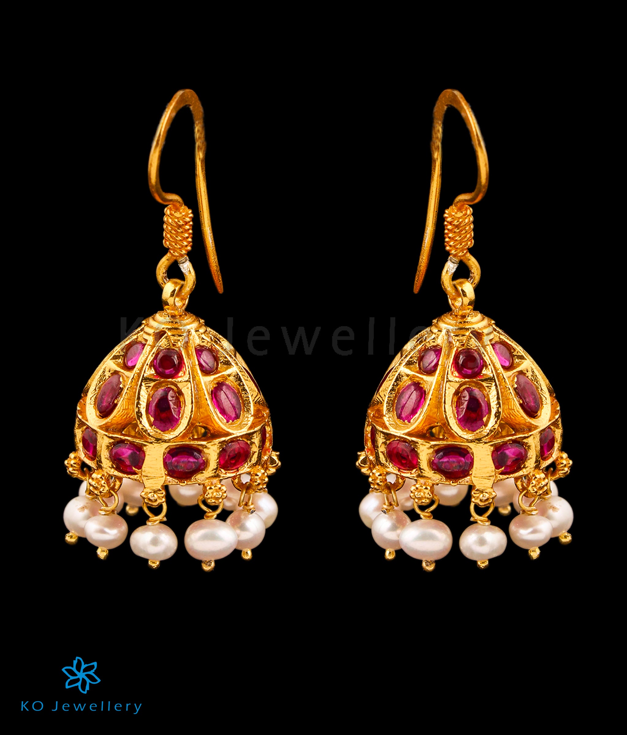Extremely attractive and skillfully handcrafted this jhumka set with red `kempu' stones is simply stunning . Handcrafted with unmatched skill and perfection using techniques used in ancient South Indian antique temple jewellery, the entire piece is crafted in pure Sterling Silver (92.5%) and gold-dipped.