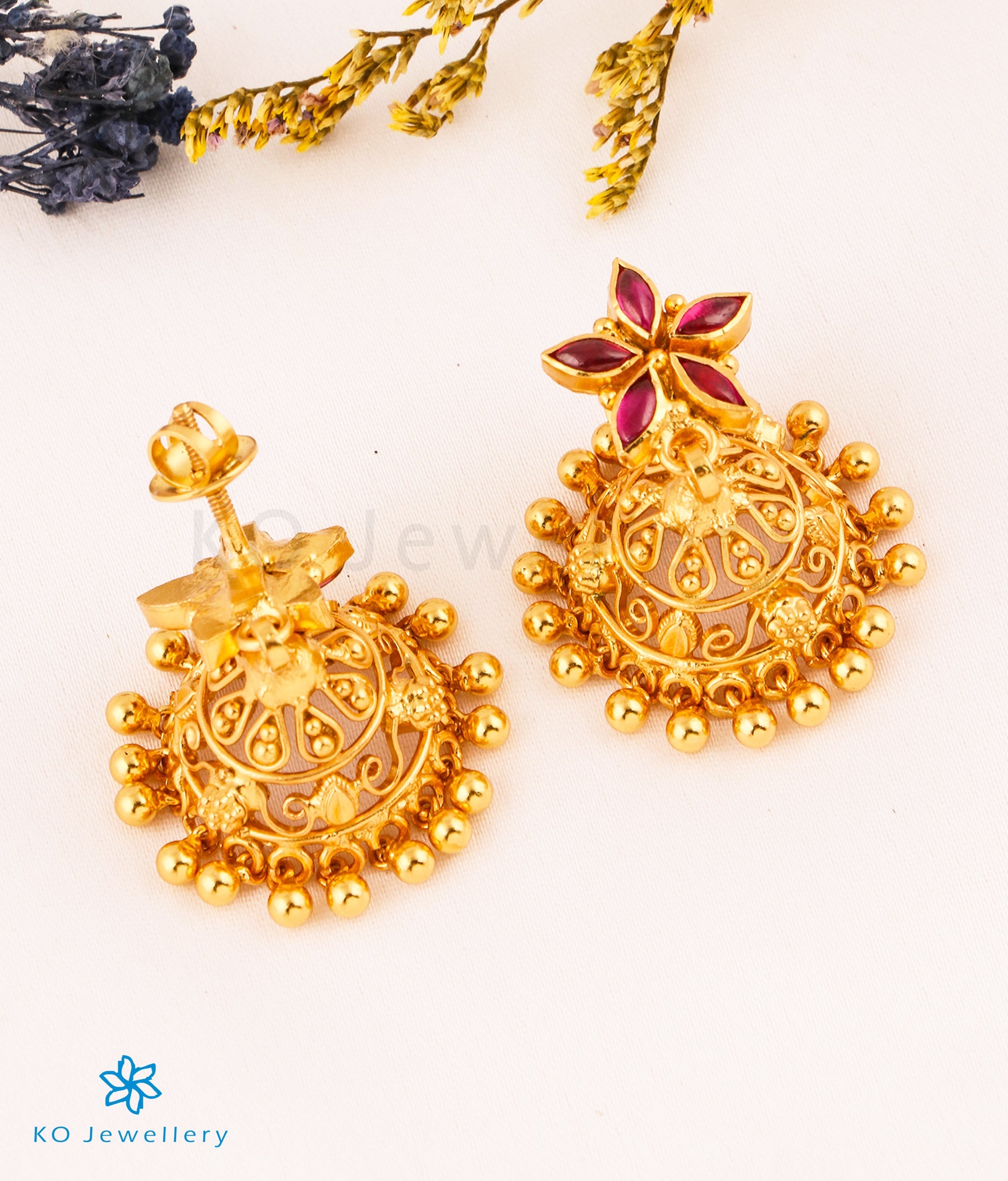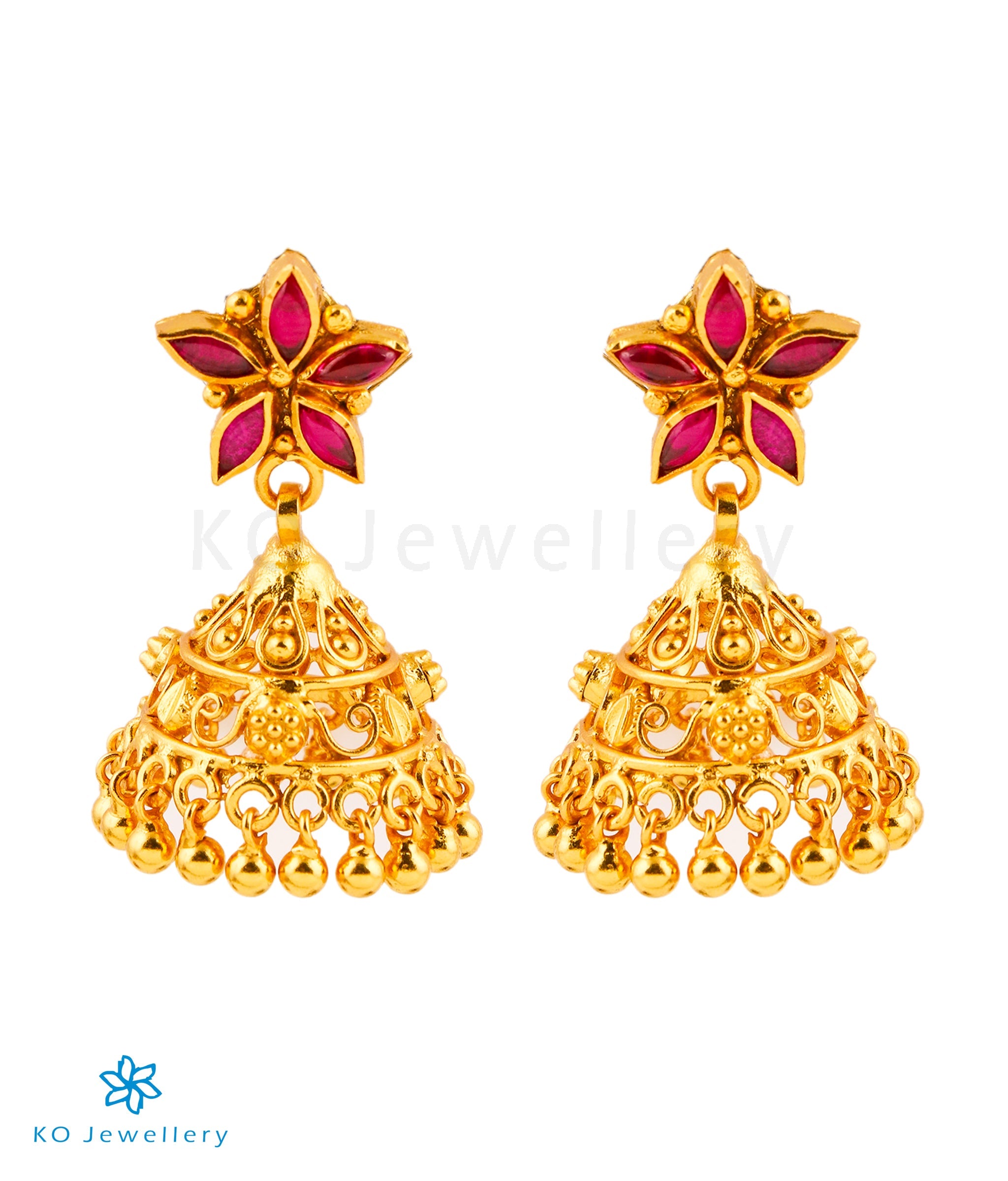 A beautiful jhumka with an intricate design, the gold-dipped finish gives it an irresistible antique charm. Crafted using techniques used in ancient South Indian antique gold temple jewellery the entire piece is crafted in Sterling Silver (92.5%) silver . This pair also makes a great earring for young girls..