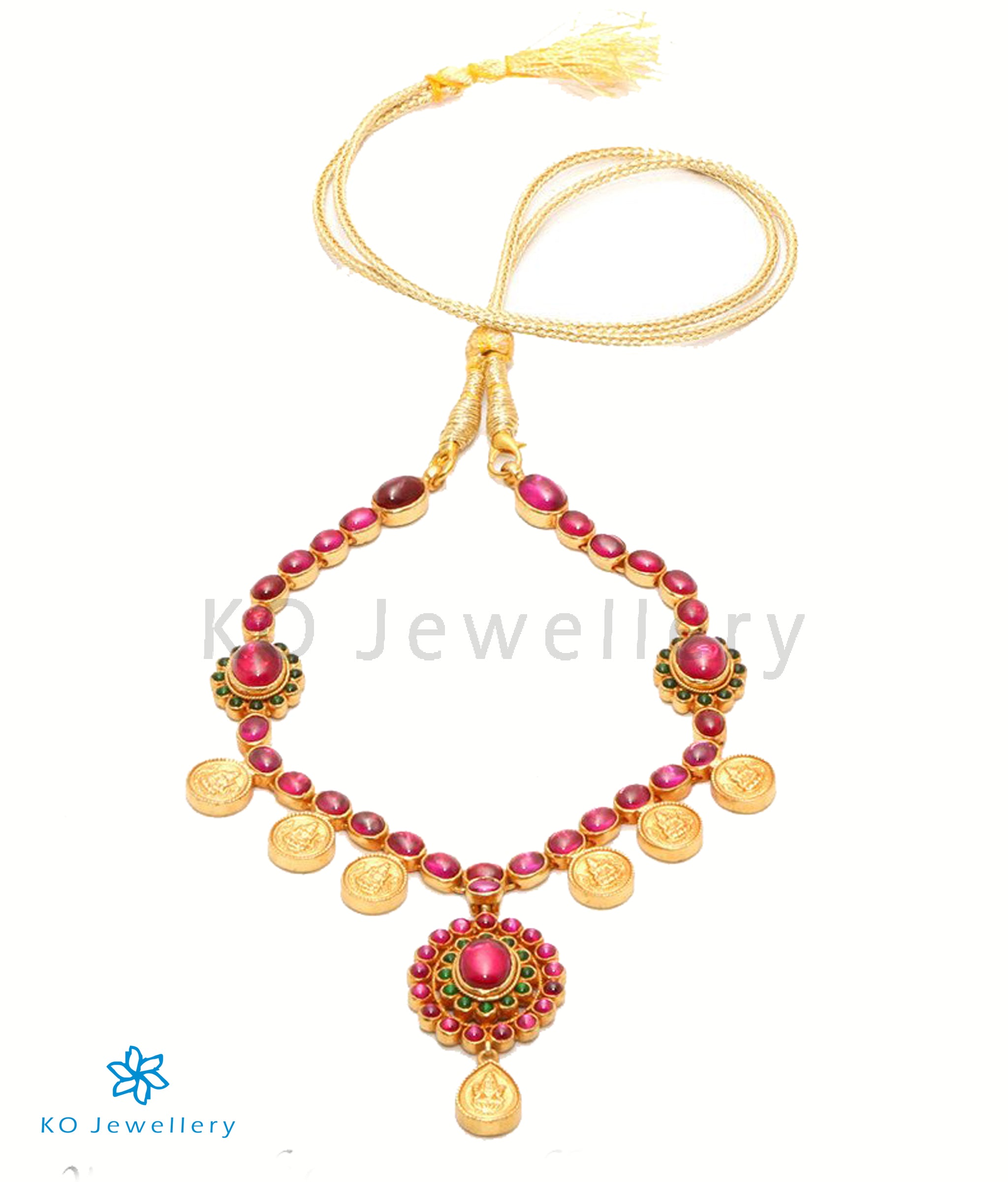 This beautiful necklace from the antique temple jewellery collection is studded with `kempu" stones with a hint of green and also has goddess Laxmi coins attached.Crafted using techniques used in ancient South Indian antique gold temple jewellery the entire piece is crafted in pure Sterling Silver (92.5%) and dipped in 24 karat gold.