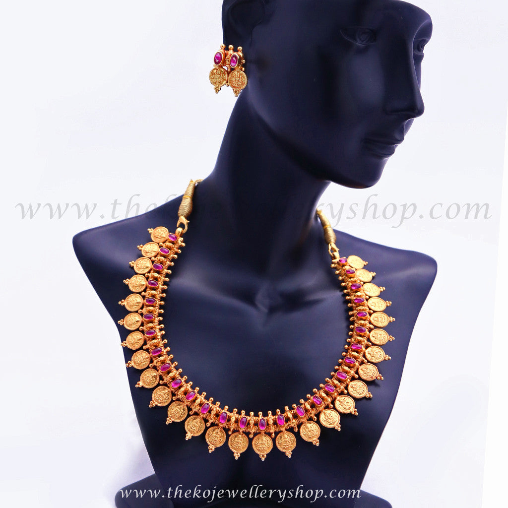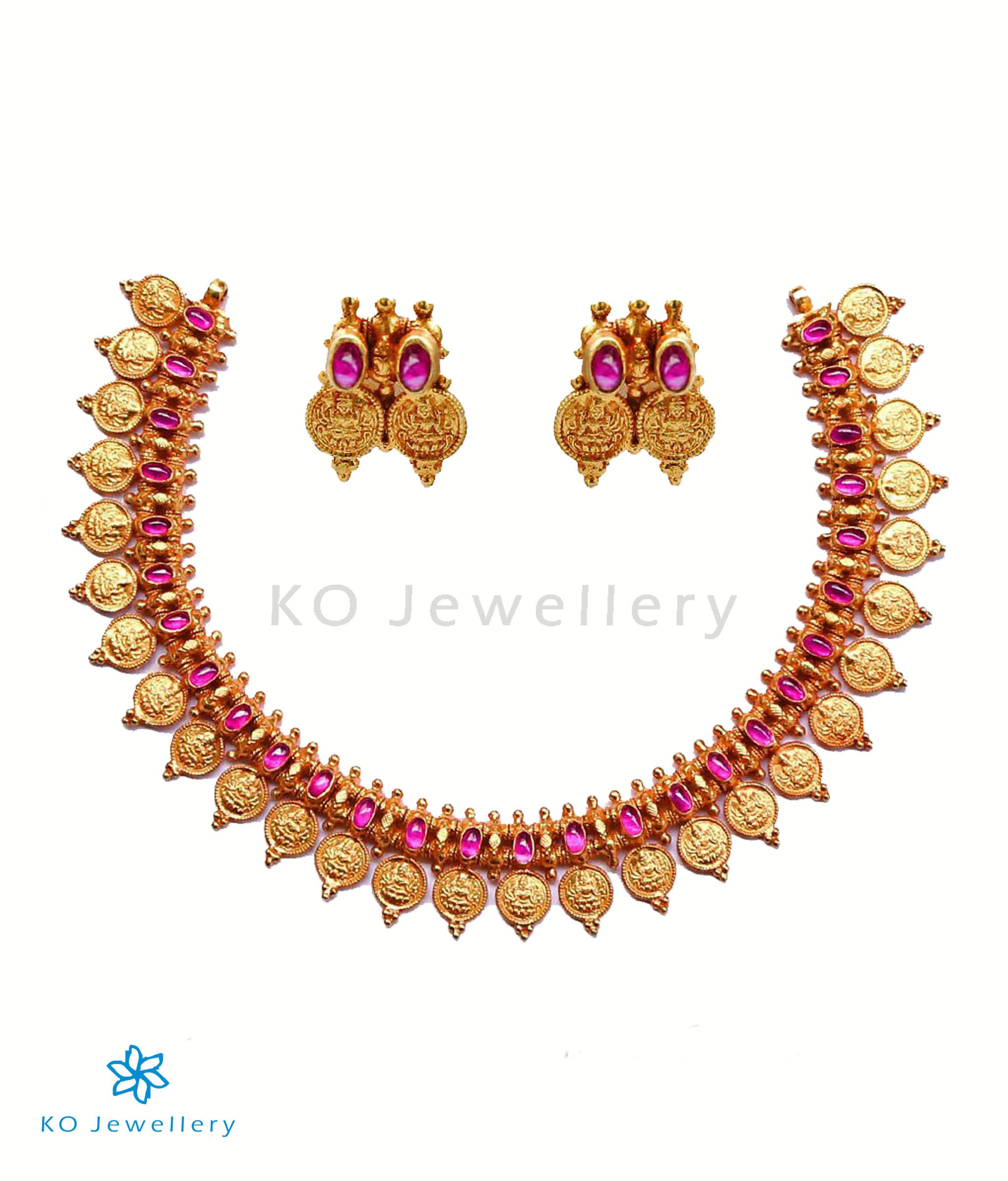This is a traditional south Indian `kasina-hara', `kasu-malai' or coin necklace, depicting Laxmi the goddess of wealth. Crafted in pure silver and dipped in 24-carat gold this is a short choker style necklace and depicts Laxmi sitting on a lotus.Part of the Temple Jewellery collection of KO it is crafted using techniques used in ancient South Indian antique jewellery. All pieces in this collection are crafted in Sterling (92.5) Silver and gold-dipped in a special process to give them an antique look.It has ear-studs to match.