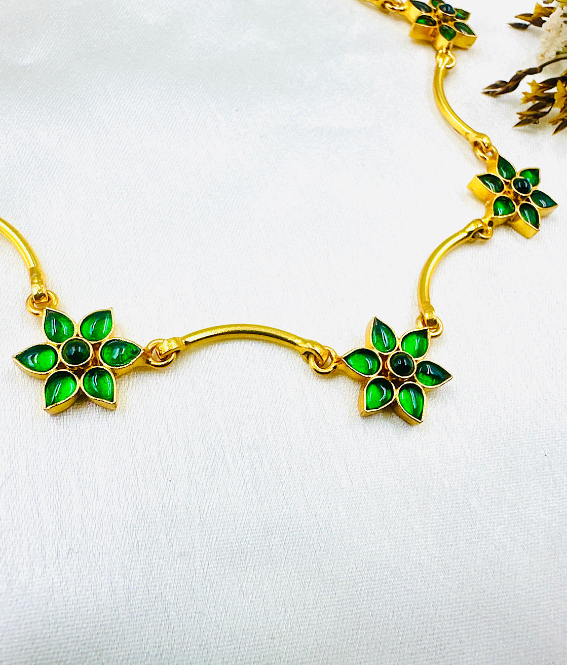 Floral and feminine this is a versatile necklace that will put you in the limelight. The necklace is crafted in Sterling Silver (92.5%) decorated with kemp stones & gold dipped to perfection.