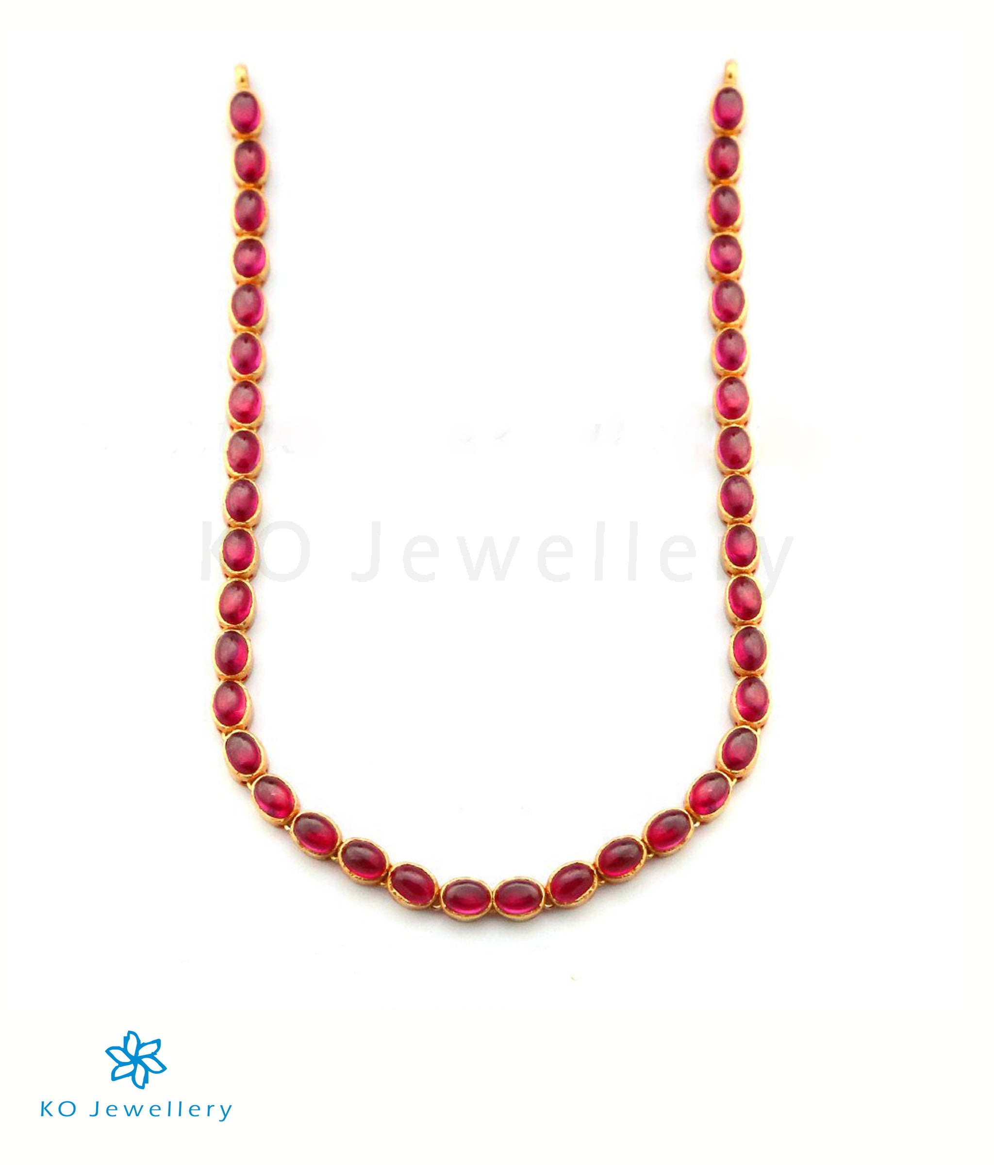 An amazingly elegant design, this is one piece of temple jewellery that every serious jewellery afficionado must possess.Crafted using techniques used in ancient South Indian antique gold temple jewellery the entire piece is crafted in pure Sterling Silver (92.5%) and dipped in 24 karat gold and is studded with kempu stones.