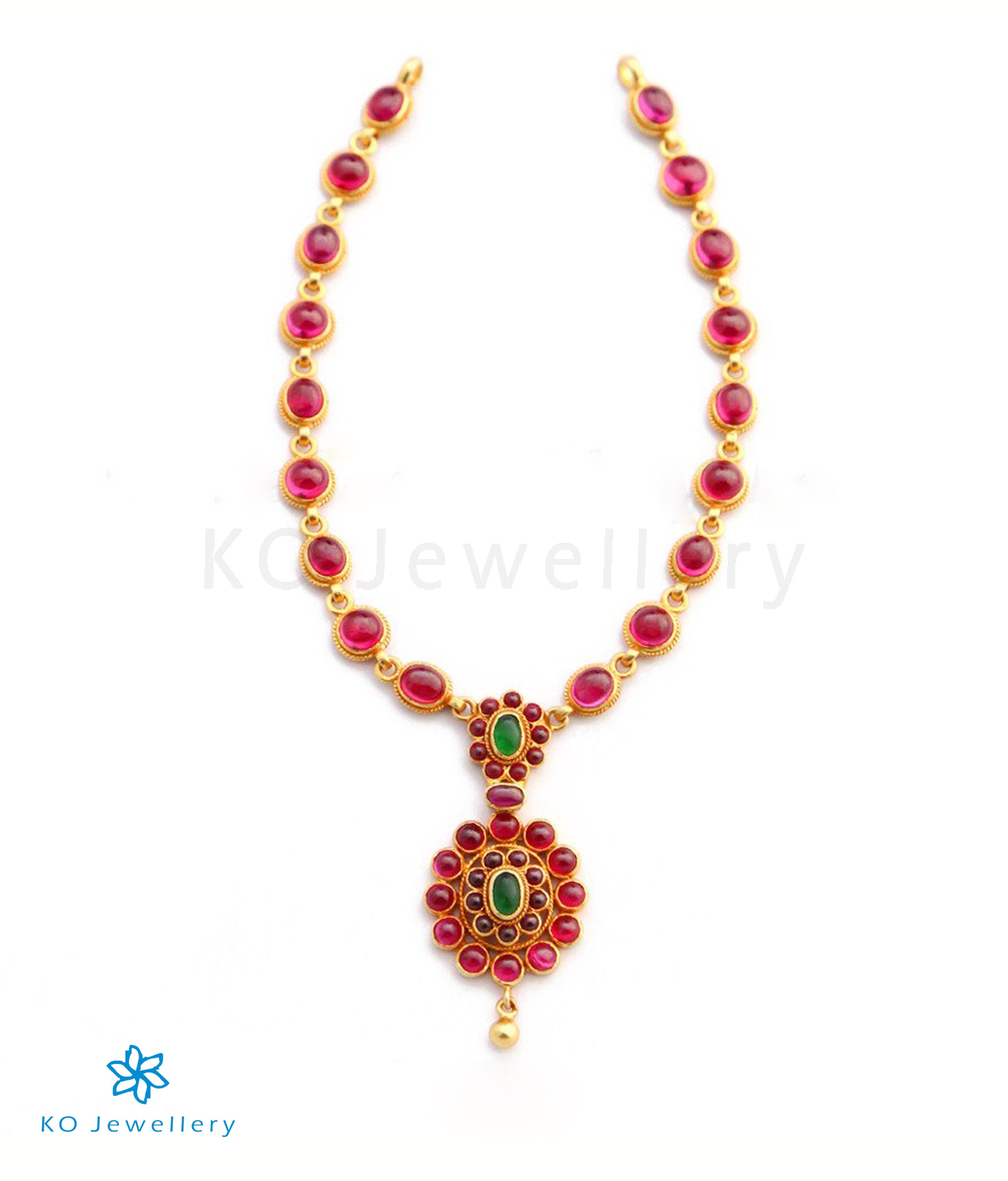 Catch everyone's attention with this beautiful necklace crafted out of kempu-stones, the light gold detailing on the edges adds to its charm.Crafted using techniques used in ancient South Indian antique gold temple jewellery the entire piece is crafted in pure Sterling Silver (92.5%) and dipped in 24 karat gold.