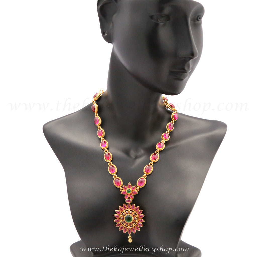 This beautiful necklace has a lovely floral-shape stone studded pendant and is part of our antique temple jewellery collection.Crafted using techniques used in ancient South Indian antique gold temple jewellery the entire piece is crafted in pure silver and dipped in 24 karat gold.