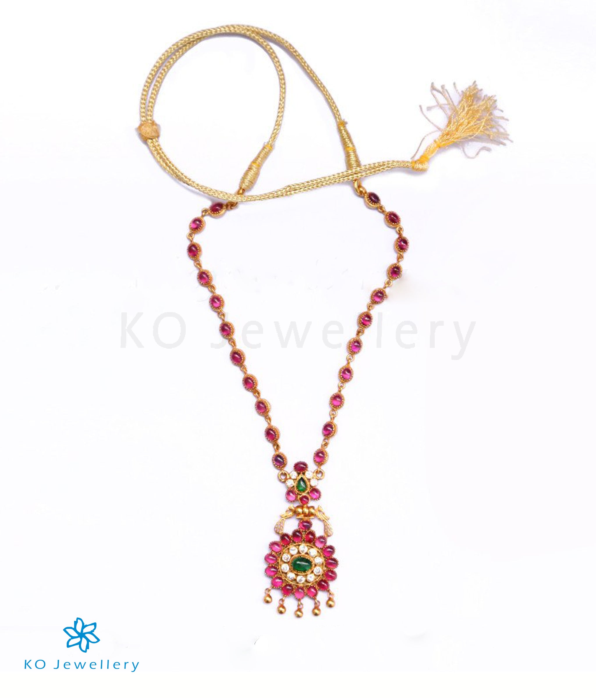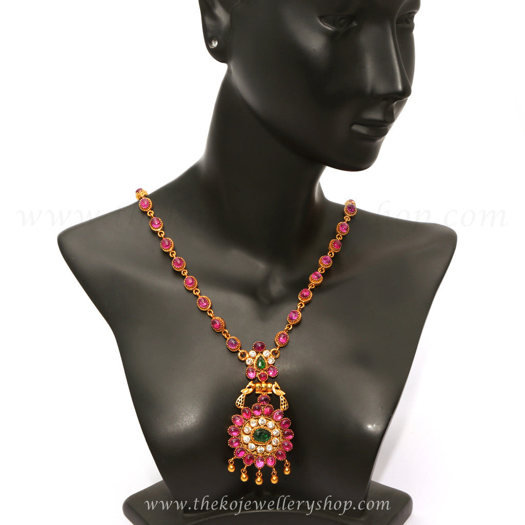 This beautiful necklace crafted out of kempu-stones has a pair of golden peacocks adorning it.Crafted using techniques used in ancient South Indian antique gold temple jewellery the entire piece is crafted in pure Sterling Silver (92.5%) and dipped in 24 karat gold.