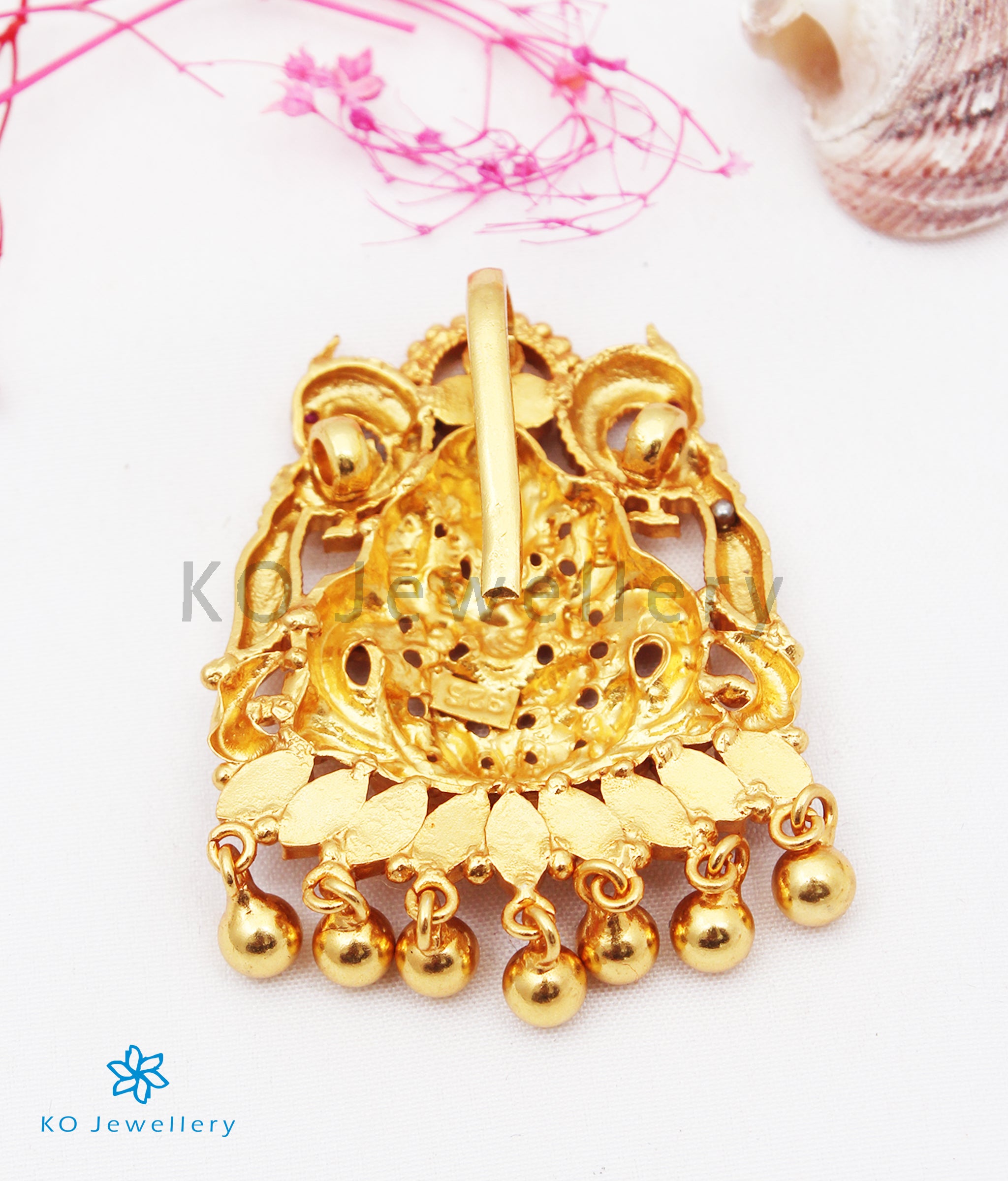 This is a traditional Lakshmi Pendant with `nakkasi' or `nakshi' work (a form of gilt and repousse technique unique to south Indian temple jewellery). Goddess Lakshmi is flanked by two peacocks and kempu stones further accentuate the design of this gold dipped pendant set handcrafted in Sterling Silver (92.5%).
