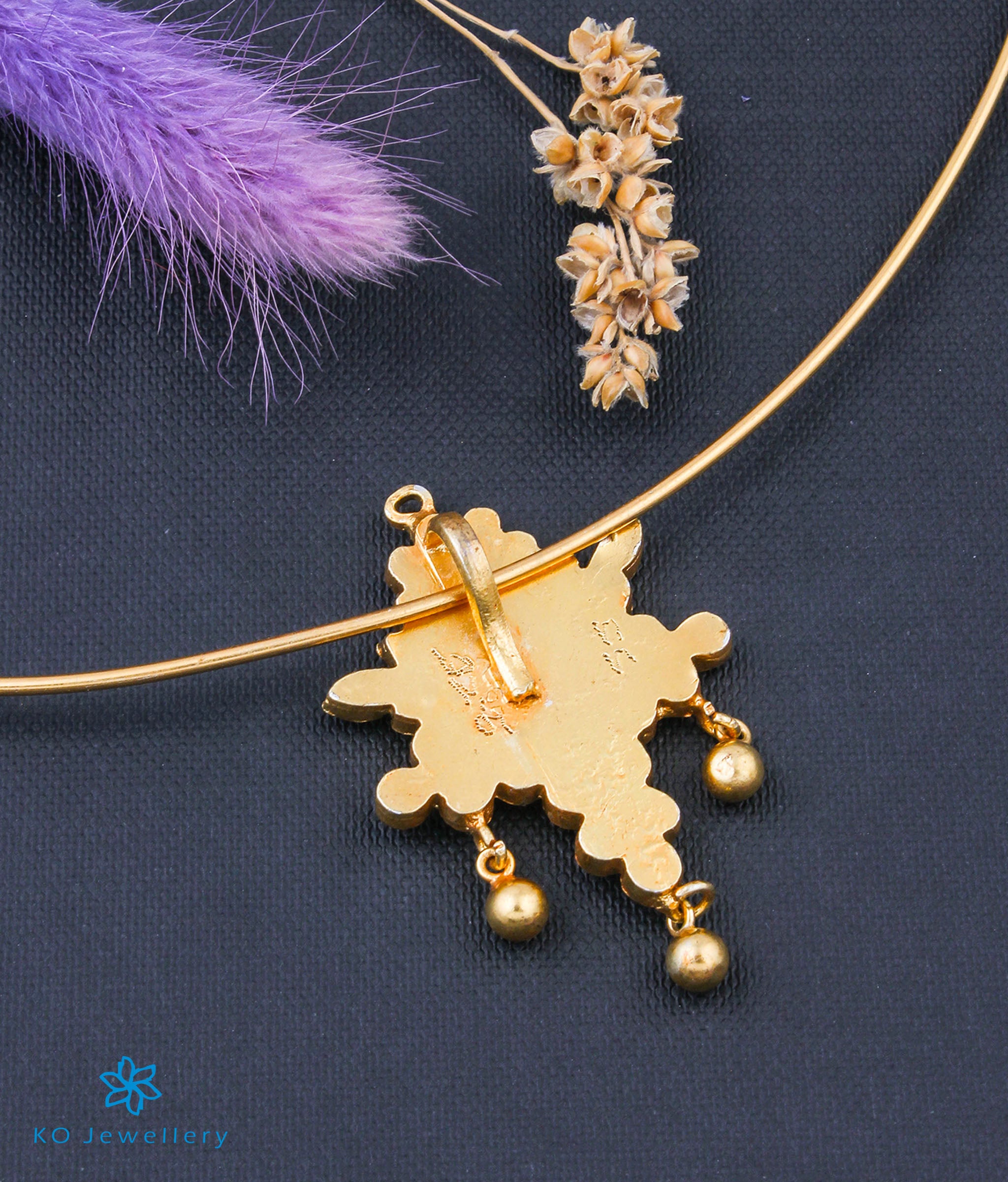 A small and ornate kemp pendant with an irresistable charm. Crafted using techhniques used in ancient South Indian antique gold temple jewellery the entire piece is crafted in pure Sterling silver(92.5%) and gold dipped.
