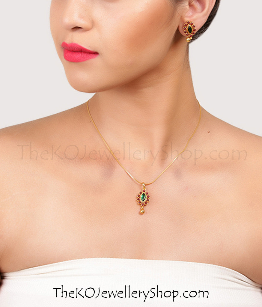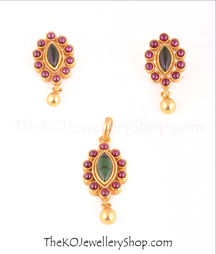 A beautiful, lightweight pendant/earrings set decorated with kempu stones.Handcrafted using techniques from ancient South Indian antique jewellery this piece displays flawless craftsmanship. All pieces in this set are crafted in Sterling (92.5%) Silver and gold-dipped in a special process to give them an antique look.