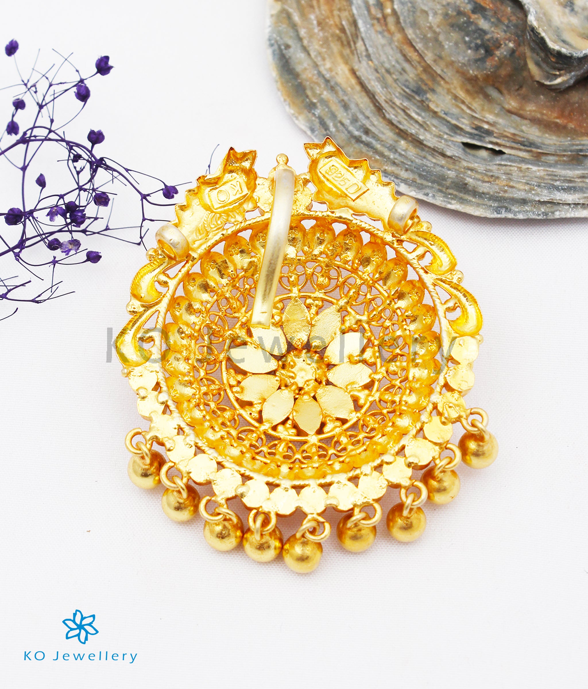 An exclusive pendant with a twin peacock design, handcrafted to perfection in Sterling Silver (92.5%), dipped in gold, and skillfully decorated .