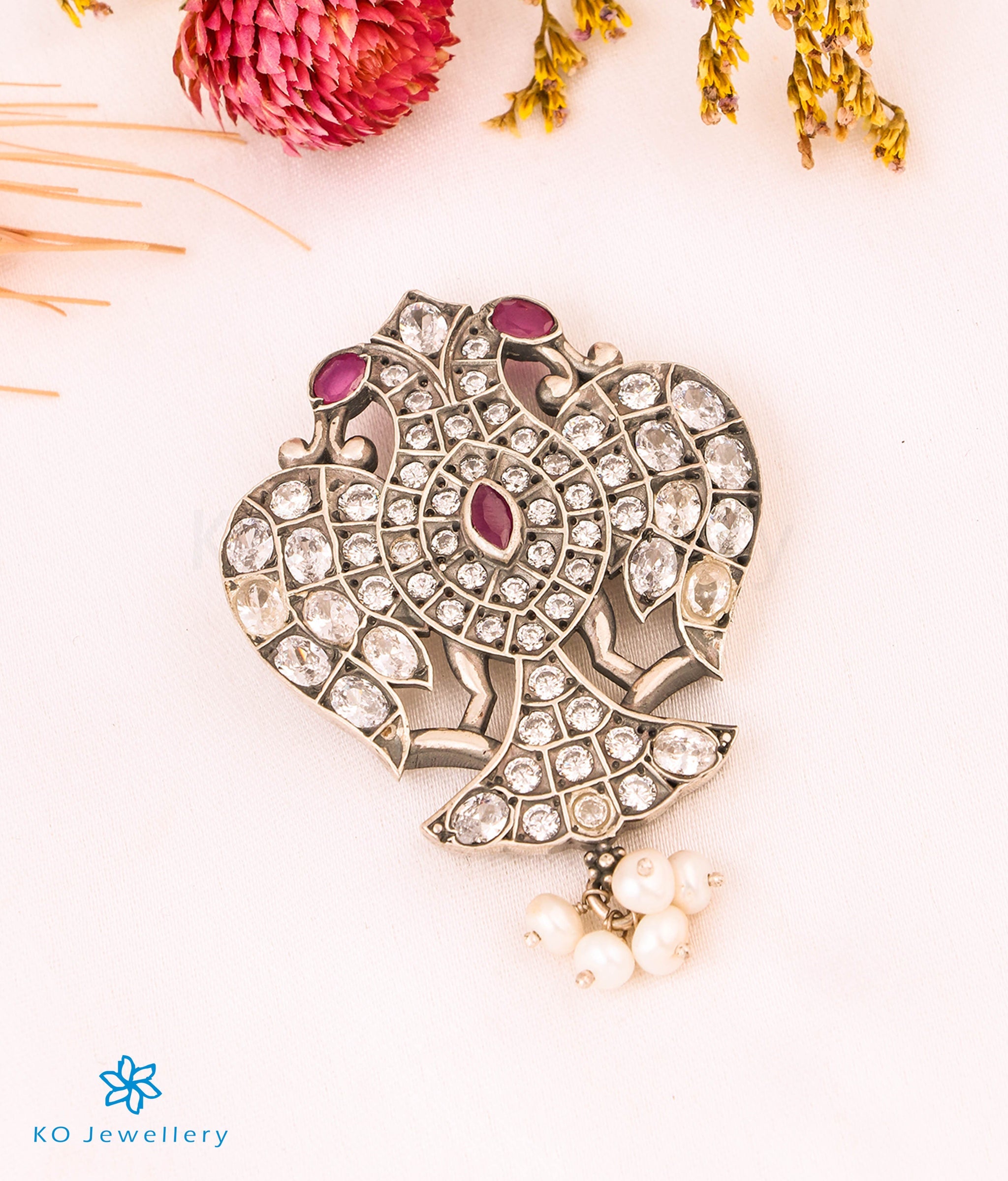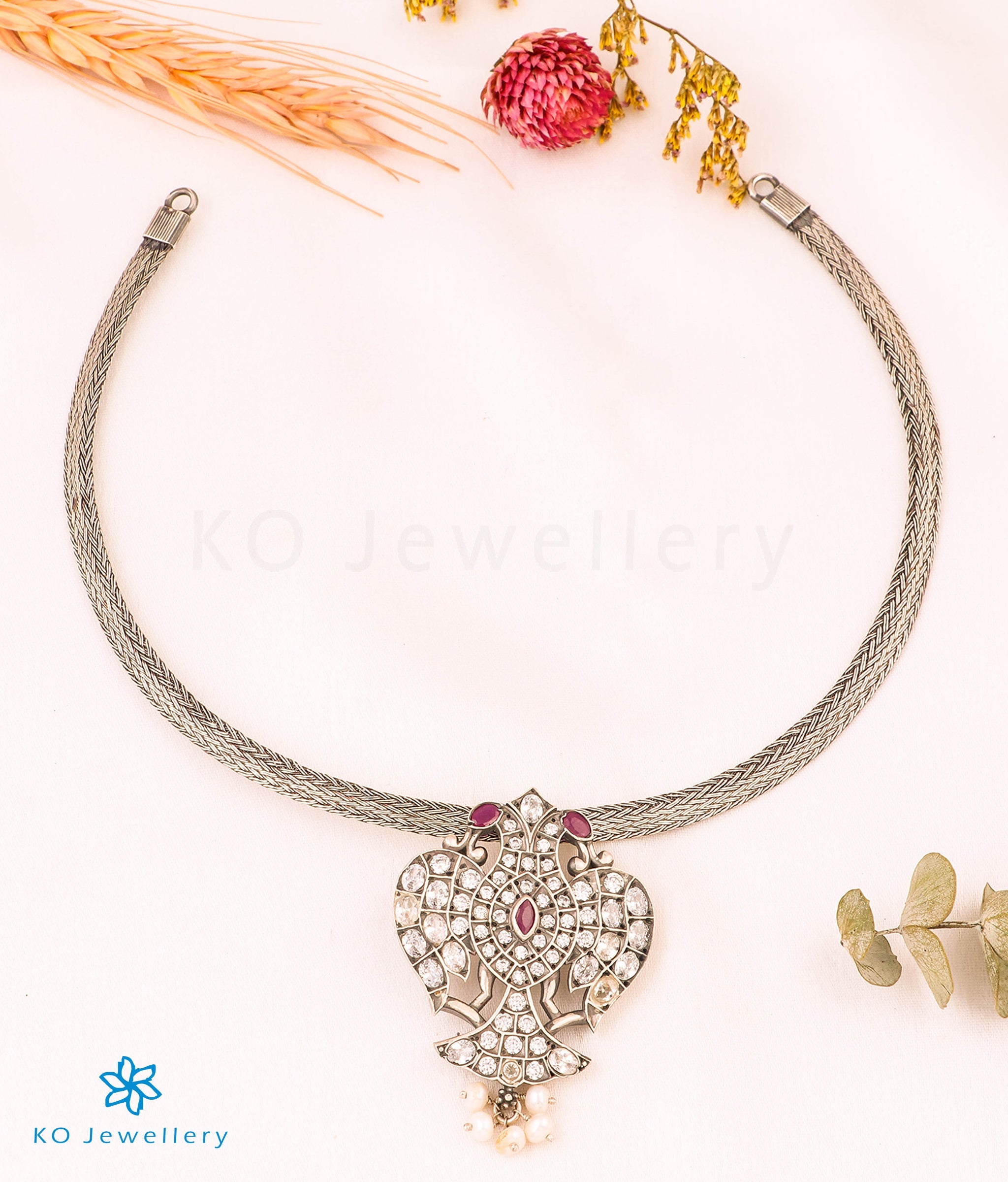 Discover heritage temple jewellery that narrates mythology using ancient motifs , in this gorgeous pendant the popular symbol of hindu mythology, Gandaberunda (a two-headed bird, believed to possess immense magical strength and is capable of fighting the forces of destruction) is etched beautifully in great detail and decorated with kemp stones.