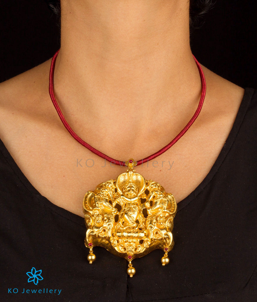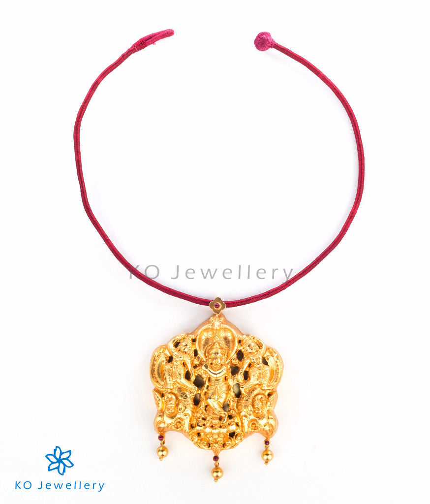 One of the most popular Indian gods Krishna and narratives of his life titled 'Rasa-Leela' or ' Krishna Leela' have been the inspiration for all forms of Indian art and jewellery is no exception.In this ornate nakkasi pendant a scene from Krishna's life is reproduced in rare detail in three dimensional repousse. A flute playing Krishna, crowned by the Serpent Kaliya, is flanked by two gopis on either side while two makara heads converge at the bottom.
