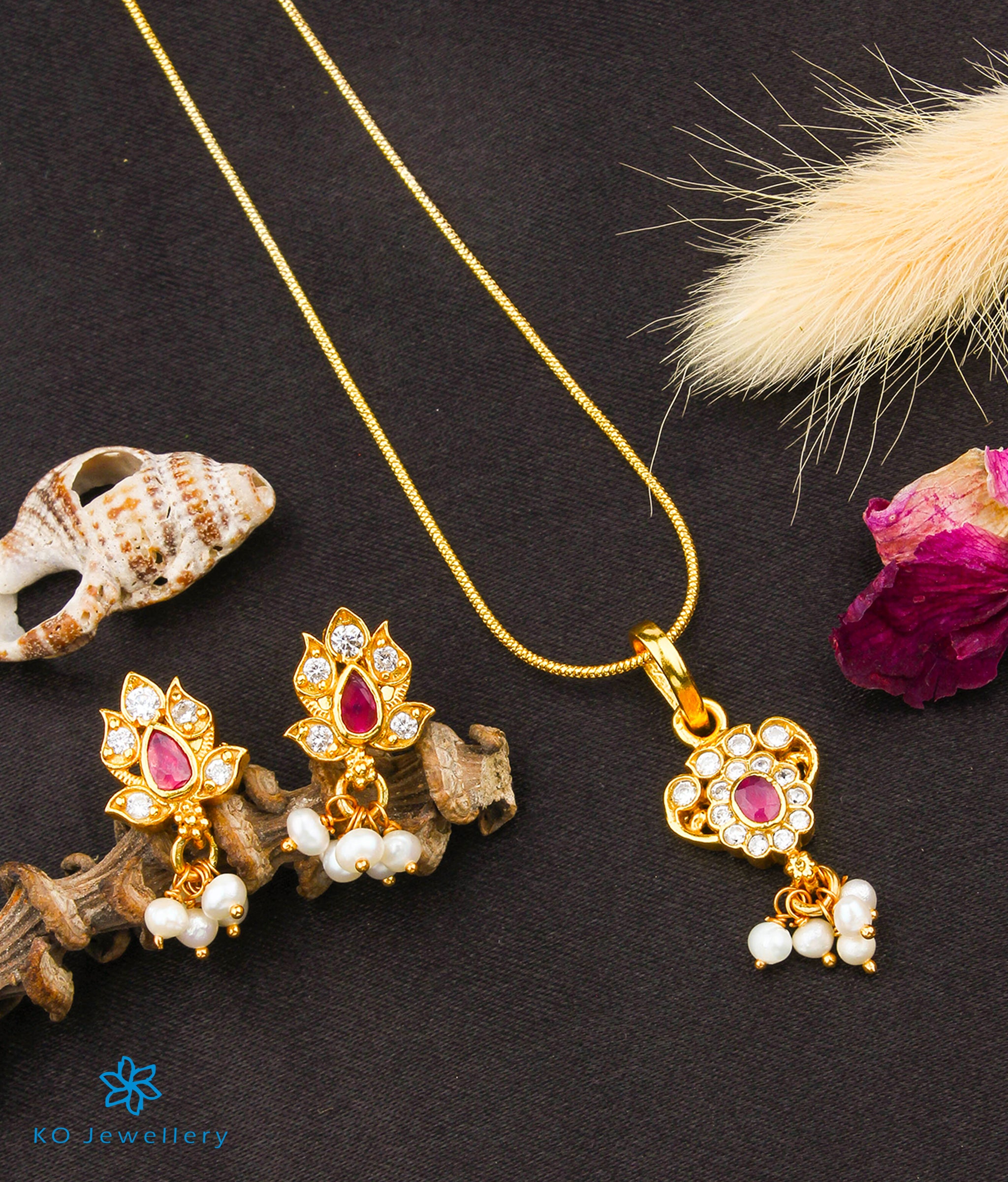 A pretty pendant set with a floral motif studded with kempu stones. Handcrafted using techniques from ancient South Indian antique jewellery this piece displays flawless craftsmanship. All pieces in this set are crafted in Sterling (92.5%) Silver and golddipped in a special process to give them an antique look. The earrings come with screw-back or bombay screw closure.