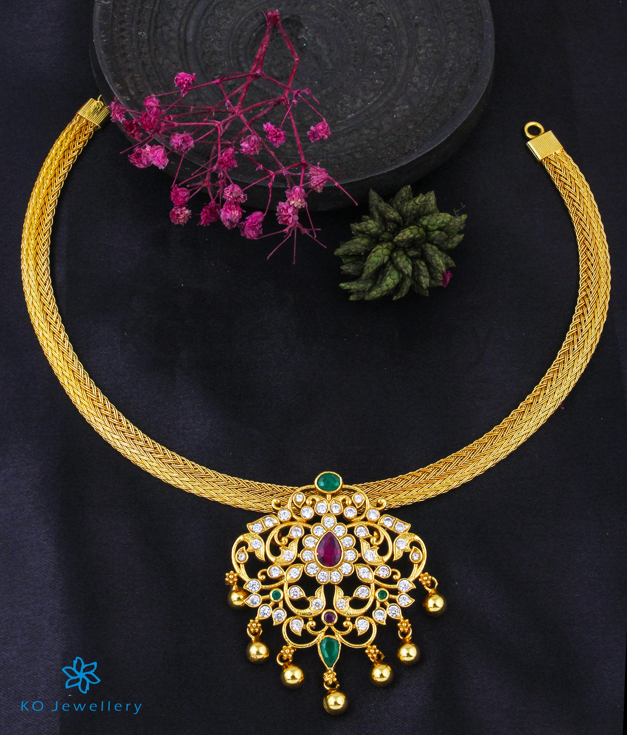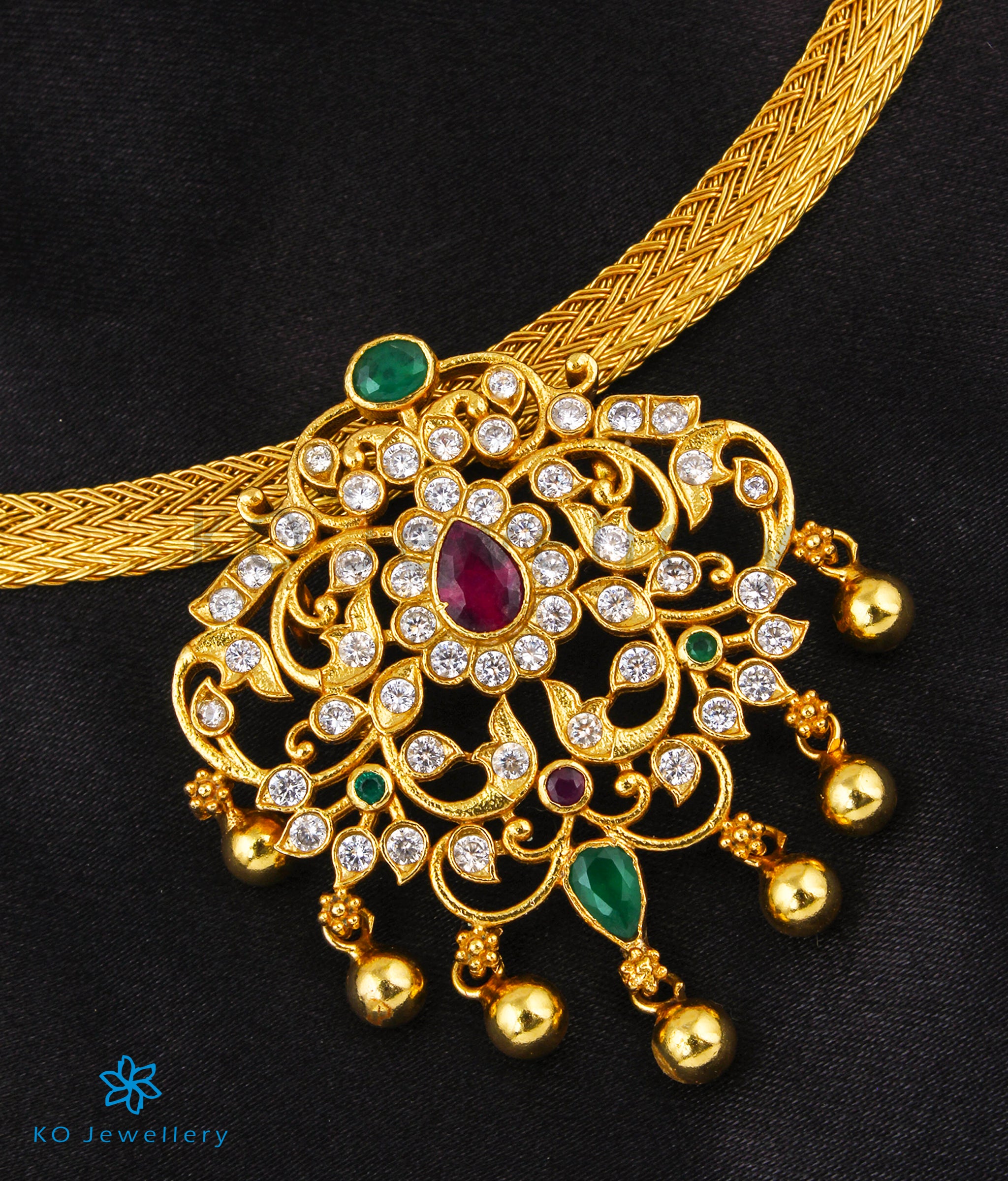 A classic and traditional design pendant with Zircon and kemp stone the sheer intricacies of design and flawless craftsmanship make this pendant special. Handcrafted using techniques from ancient South Indian antique jewellery this piece is crafted in Sterling (92.5) Silver and gold-dipped in a special process to give them an antique look.