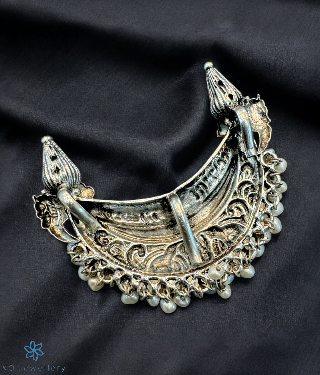 Another version of the Kodava Kokkethathi pendant traditionally worn by married women from Coorg in Karnataka. This pendant is crafted in Sterling Silver (92.5%) and oxidised to perfection. It has a traditional crescent shaped design with a serpent at the helm and the rim of the pendant is fringed with pearls.