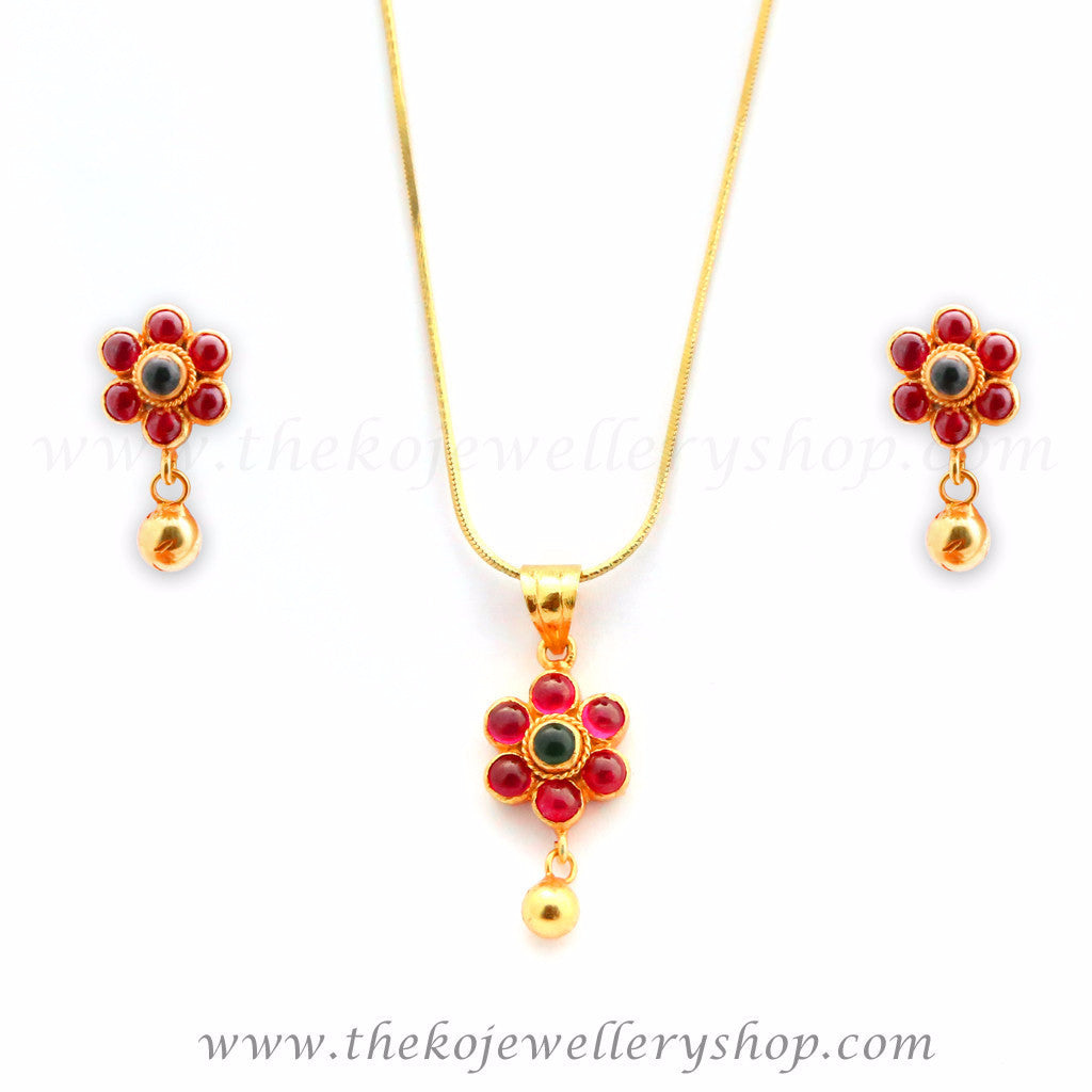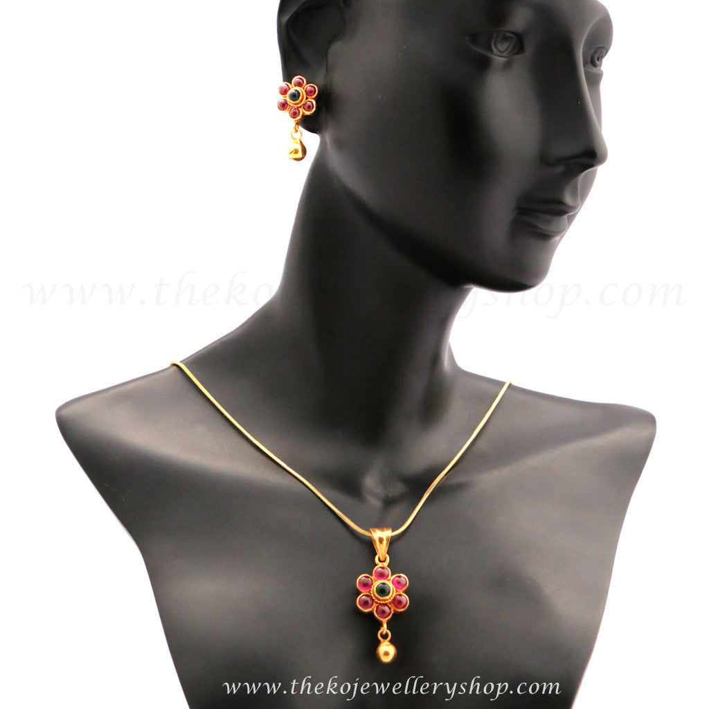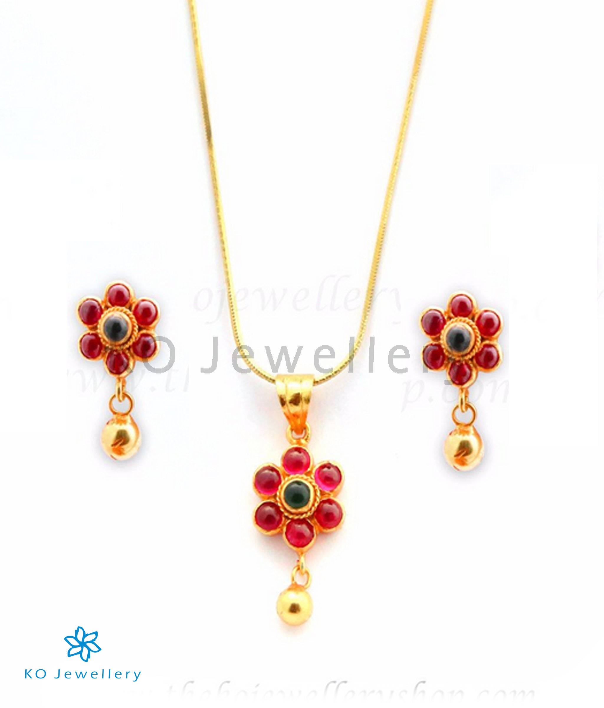 Celebrate nature with this floral-shaped pendant set from our antique temple jewellery collection.Crafted using techniques used in ancient South Indian antique gold temple jewellery the entire piece is crafted in Sterling Silver (92.5%) silver and dipped in 24 karat gold.The pendant in this set is bigger than the ear-studs and the ear-studs have a screw-back as shown in picture.