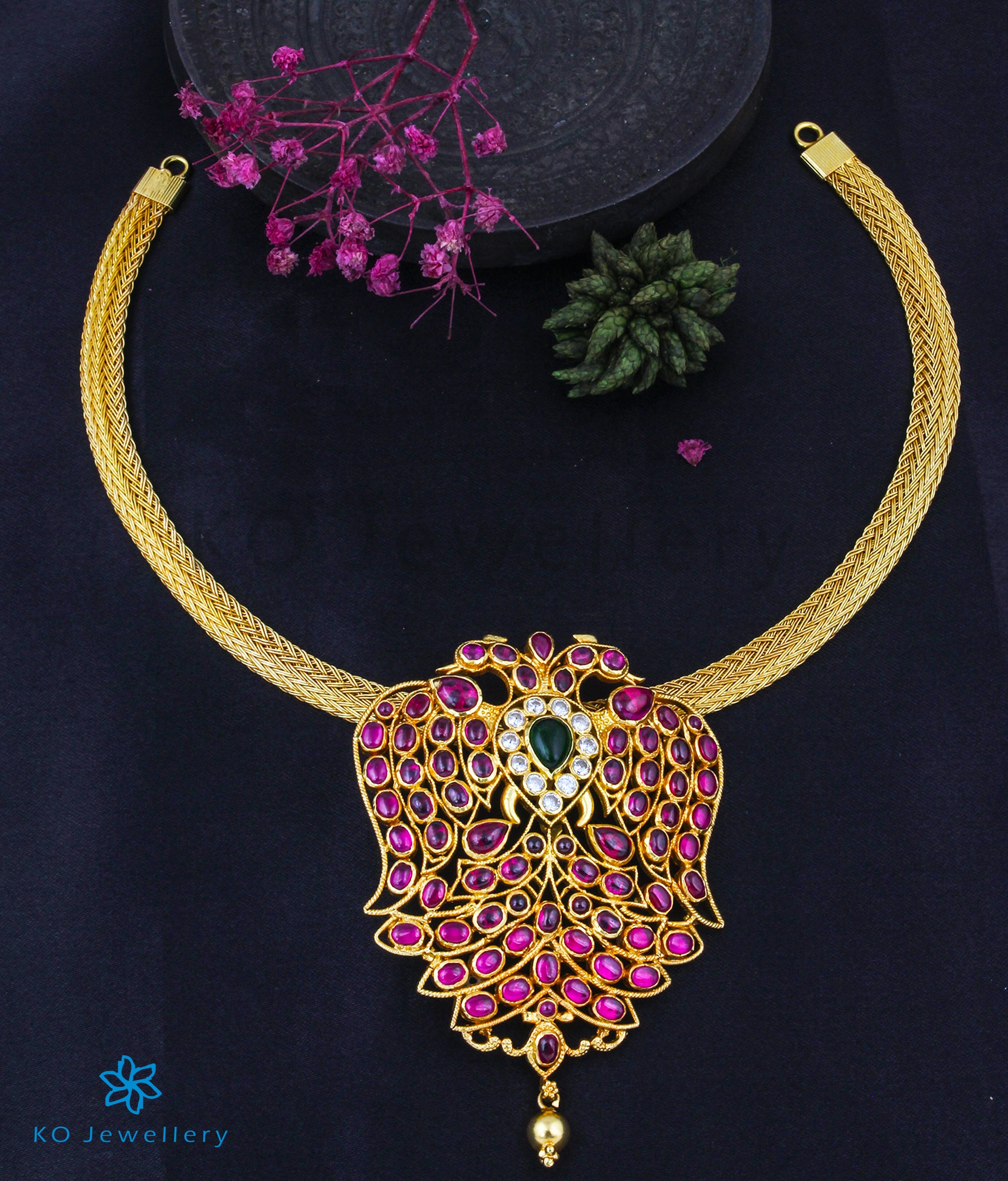 The Gandaberunda is a mythical two-headed bird used as a royal emblem of the Mysore royal family, it forms the main motif here. The sheer intricacies of design and flawless craftsmanship make this pendant/earrings set special. Handcrafted using techniques from ancient South Indian antique jewellery this piece is studded with kemp stones. All pieces in this collection are crafted in Sterling (92.5) Silver and gold-dipped in a special process to give them an antique look.