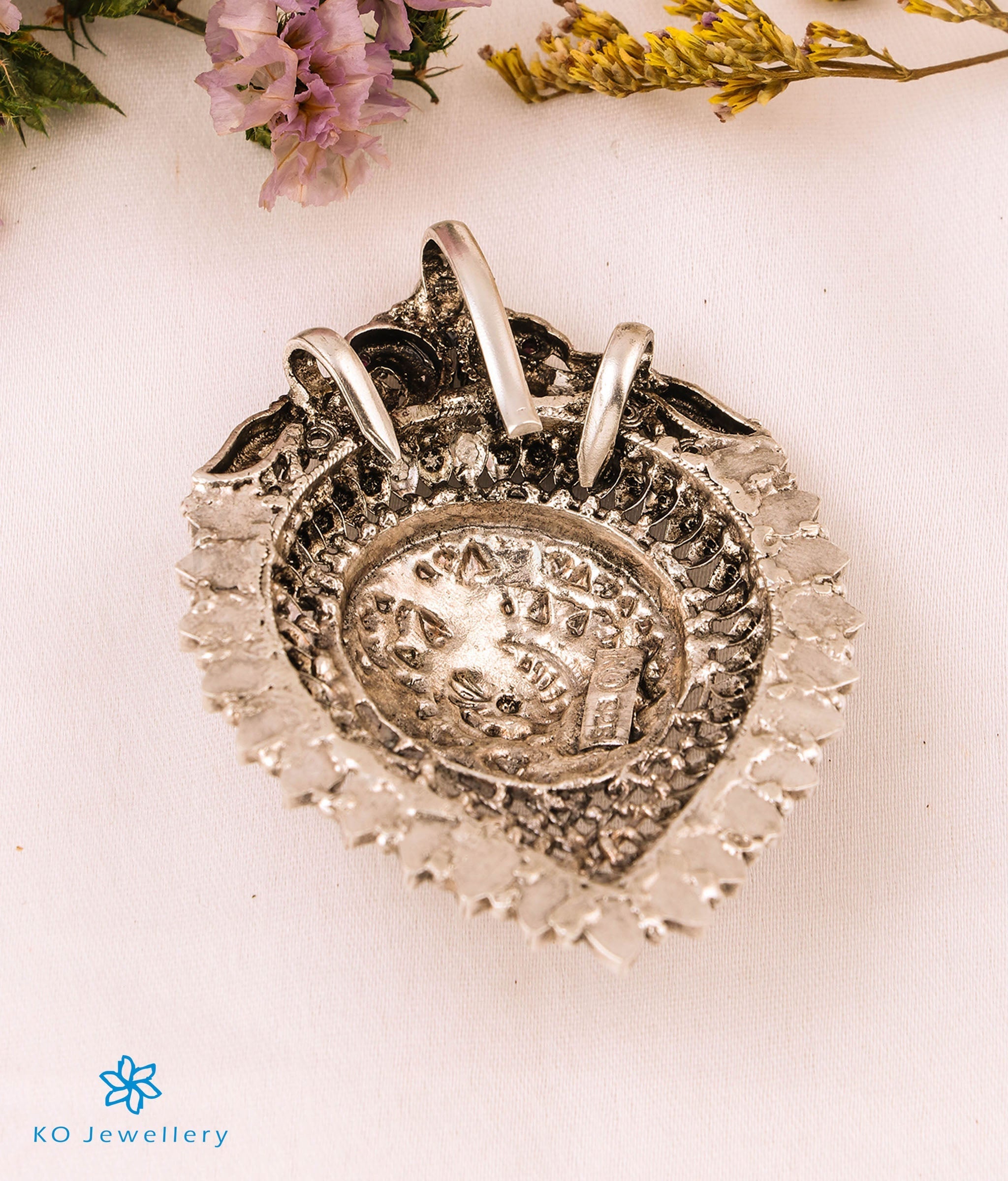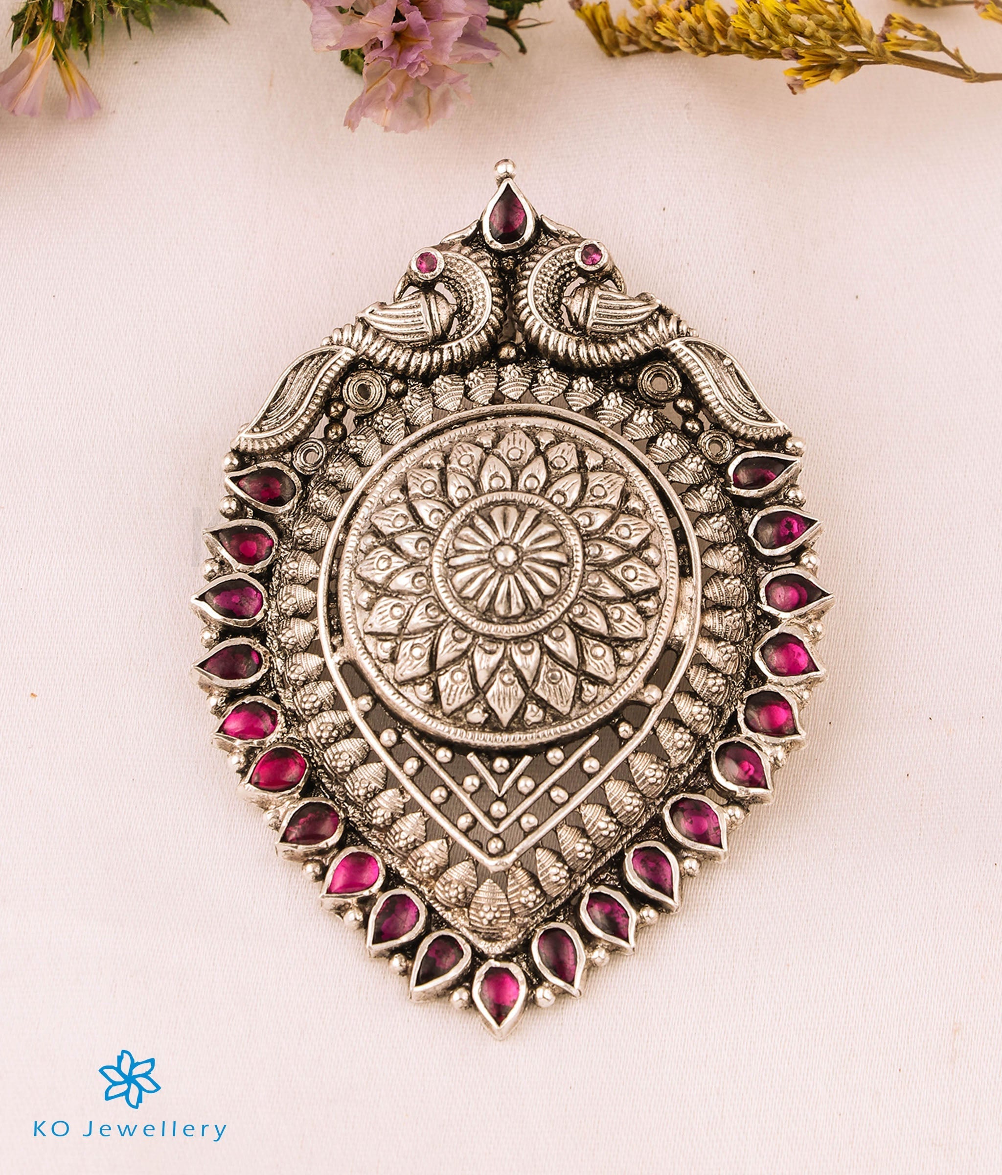 Amazingly graceful and essentially ethnic this pendant made up of a gorgeous intricate Pure Sterling Silver (92.5%) pendant topped with twin peacocks and decorated with kemp stones is simply stunning.