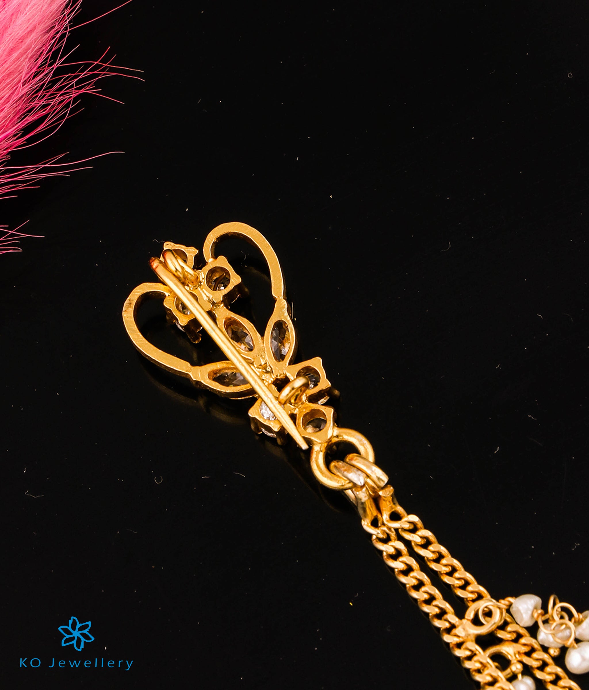 Awe everyone with this impeccable twin pendant brooch crafted in Sterling Silver (92.5%) and held together by Pearl chains. The brooch is decorated with high quality AAA+, sparkling Cubic Zirconia which give a superior shine and brilliance, and kemp stones with Pearl. It is crafted with a flawless finish and a pin at the back with a safety-lock . This is a unisex piece of jewellery that can be used by both men and women. Wear it on a shirt , suit or a saree this is one versatile design.