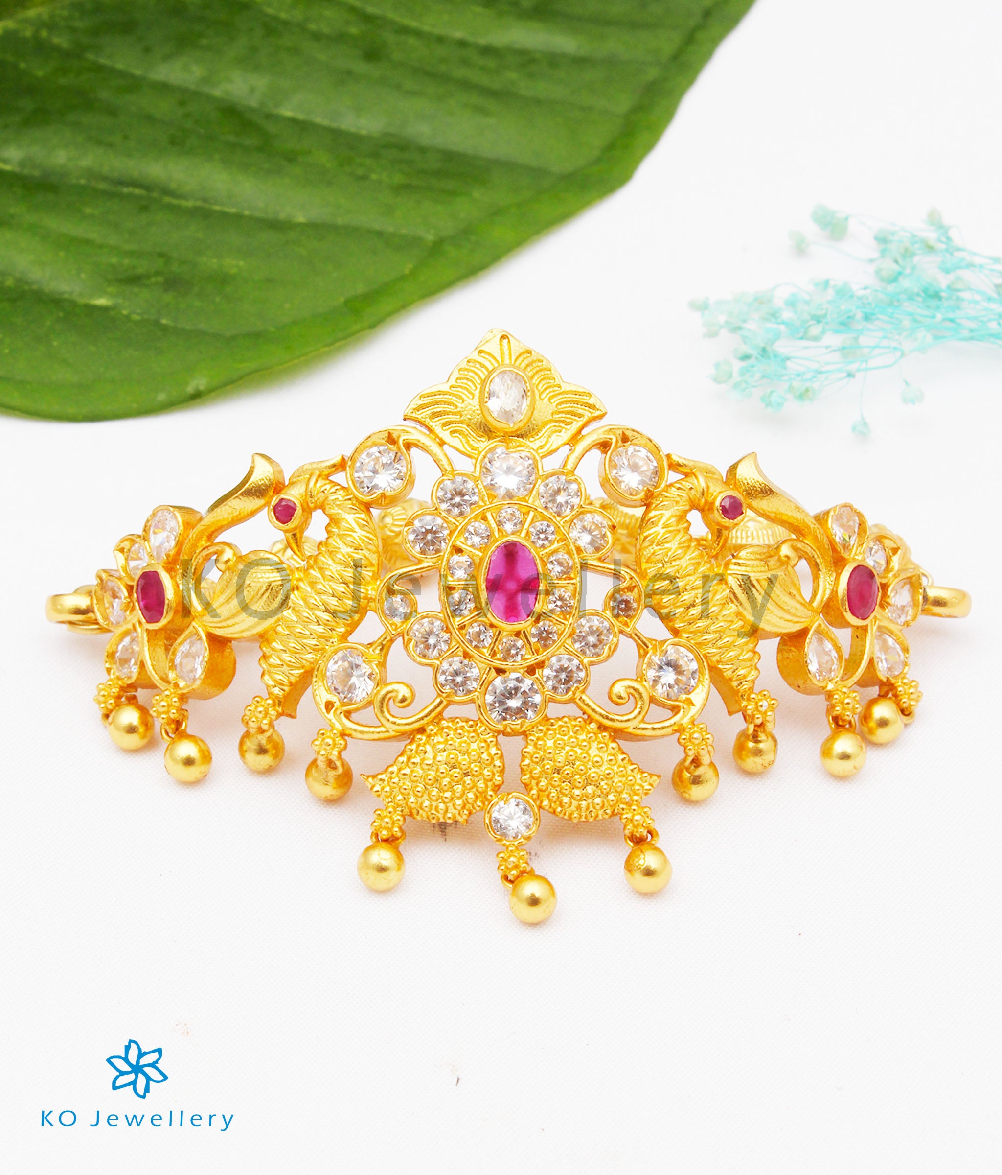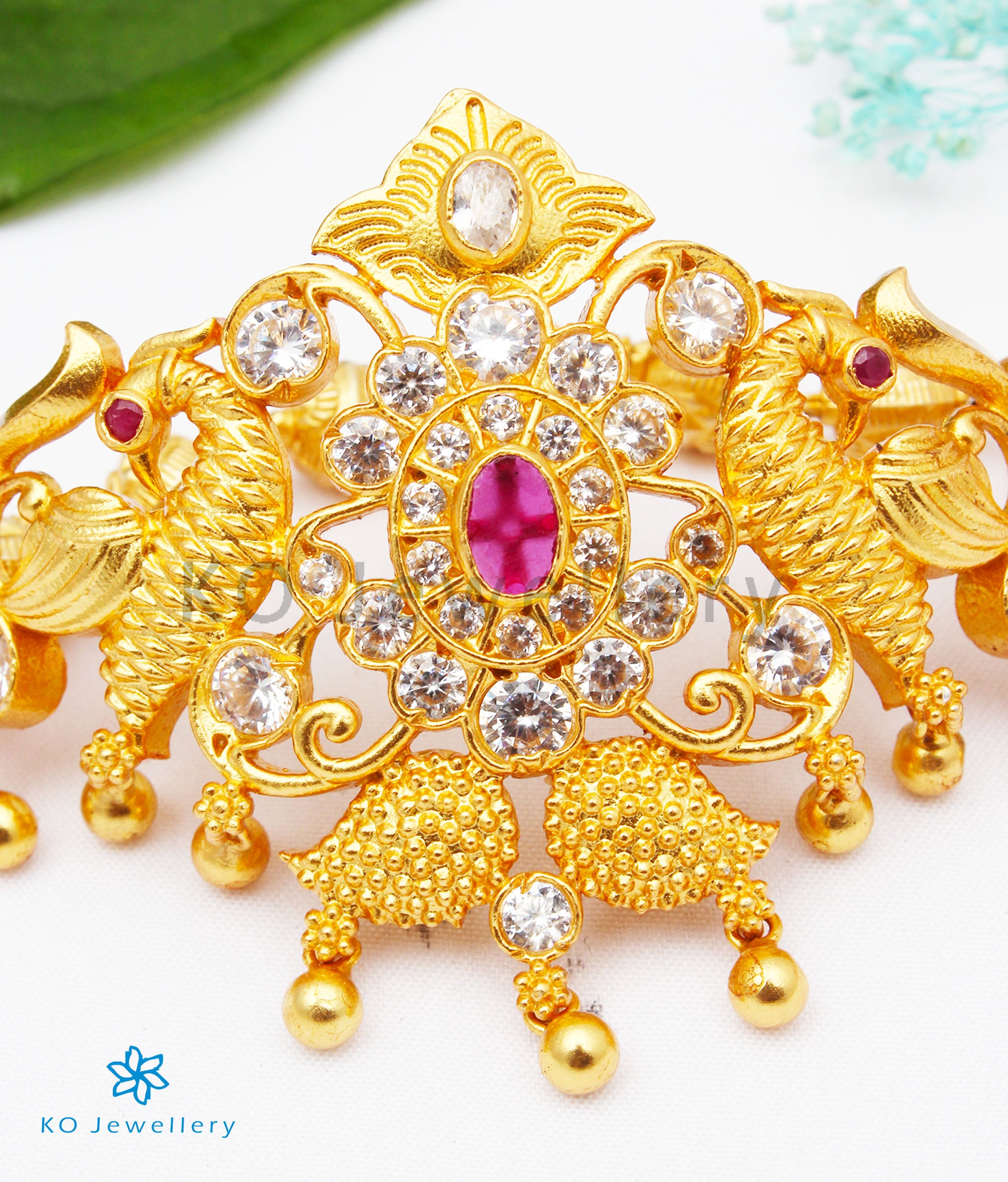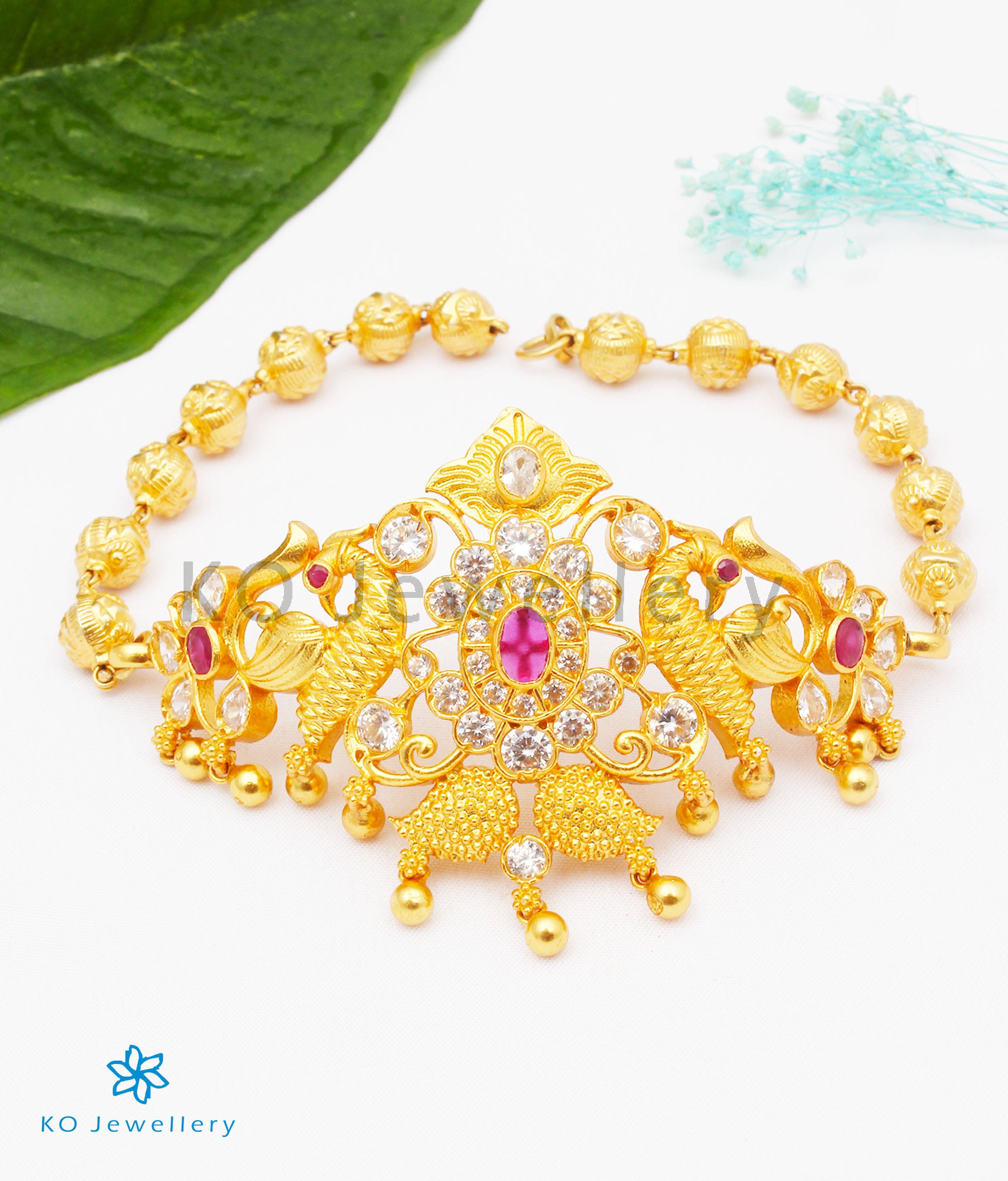 An ornate peacock motif choker-necklace, this is a versatile piece that can be paired with ethnic attire or sarees. It has a intricate pendant with kempu stones and two peacocks attached to a beads chain. This necklace is crafted in Sterling Silver (92.5%) using techniques used in ancient South Indian antique gold temple jewellery.