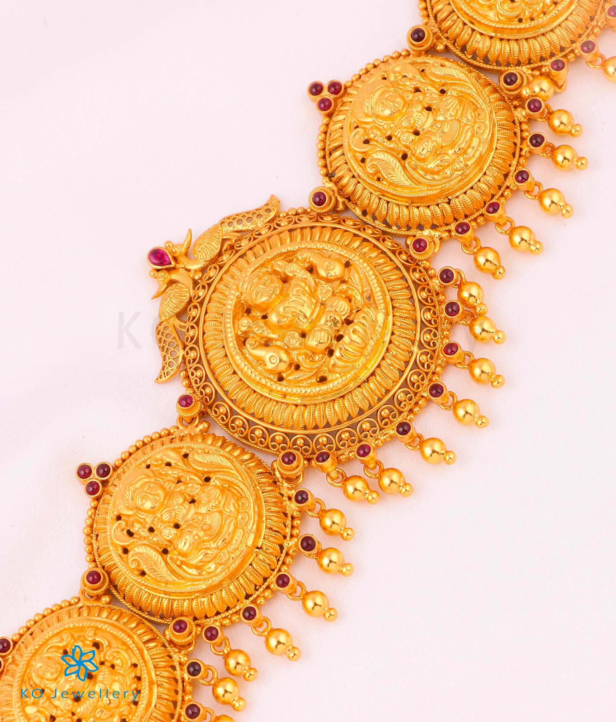 A stunning waist belt handcrafted in a traditional design in Sterling Silver (92.5%) , decorated with five goddess Lakshmi pendants. The Goddess is sitting on a lotus, while plumed peacocks make up the rest of the design.The sheer intricacies of design and flawless craftsmanship make this waist belt handcrafted using the ancient nakkasi technique special.Variously called `Daabu' , `Vaddanam' , `Oddiyanam' or `Sonta patti' the waist belt is an important component of a bride's attire in South India. This waist belt has a chain at the back with links and is adjustable to any waist size.