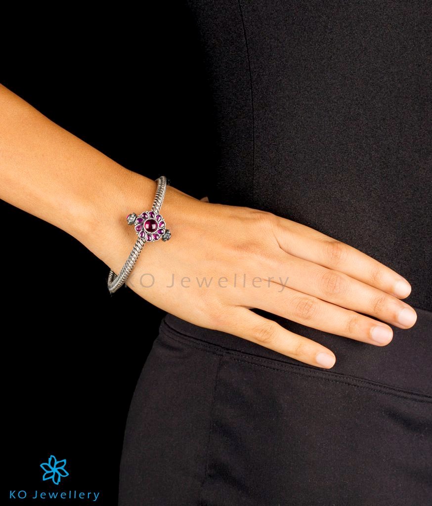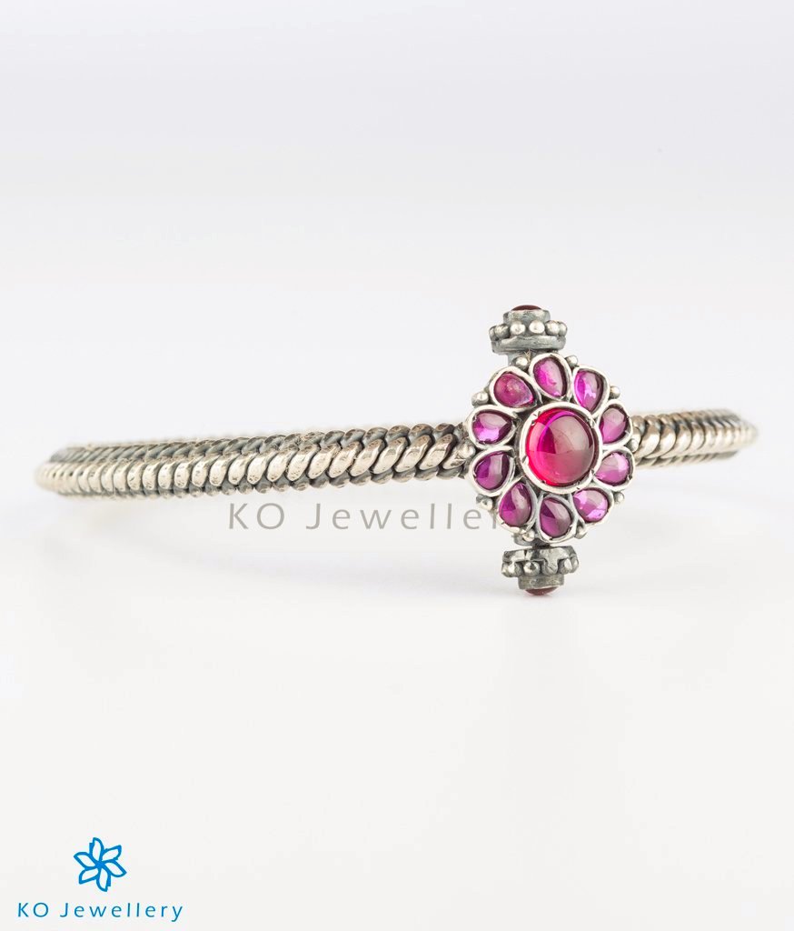 The Golusu is an antique Sterling Silver (92.5%) traditional-design, twisted bracelet from South India studded with `kemp' (red) stones. Traditionally called a Kolusu or Golusu bracelet it is made by twisting together solid silver wire with great skill and finesse. It is handcrafted using techniques used in ancient South Indian antique gold temple jewellery , the entire piece is crafted in pure silver and oxidised. It is an openable bracelet with a screw and can fit almost all sizes.