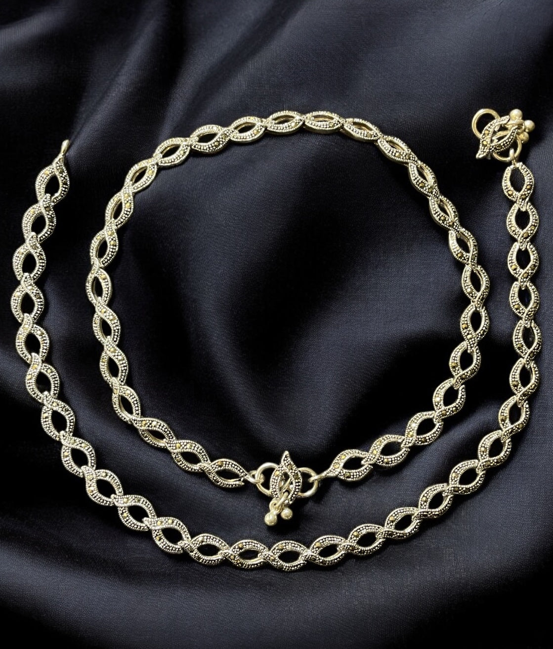 Elevate your style with these exquisite Sterling Silver (92.5%) anklets, featuring a stunning, intricate design that is perfect for any occasion. Adorned with high-quality Swarovski Swiss Marcasite gemstones, these anklets shimmer and sparkle, capturing the light beautifully with every step you take. The combination of the premium silver and the dazzling marcasite stones creates a timeless piece, ideal for bridal wear or adding a touch of luxury to your everyday look. Expertly crafted for elegance and sophistication, these anklets are a must-have accessory that will effortlessly elevate your collection.
