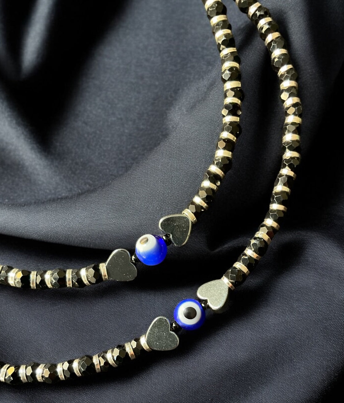 Accented with black Onyx beads and Evil eye beads, believed to have protective properties