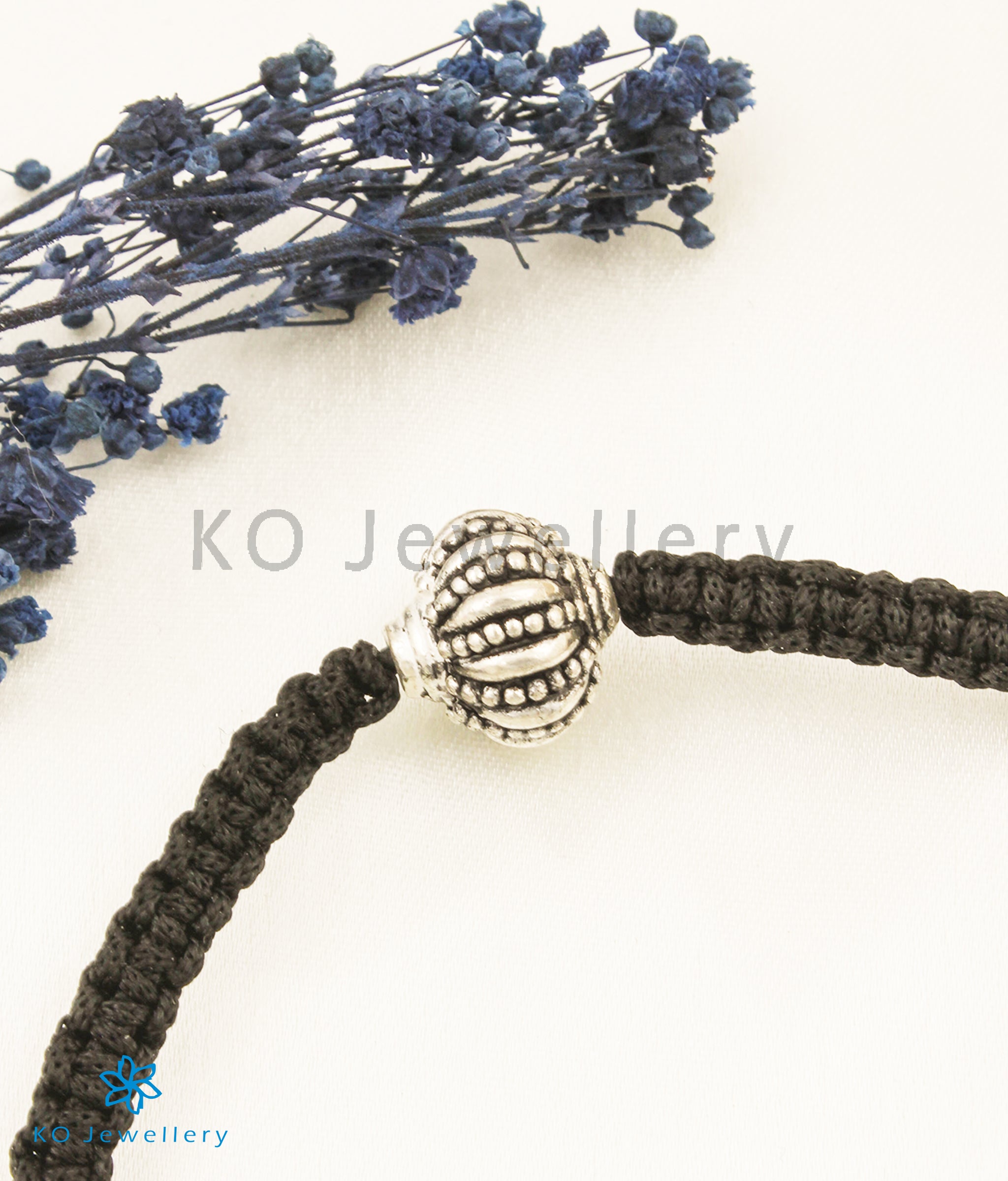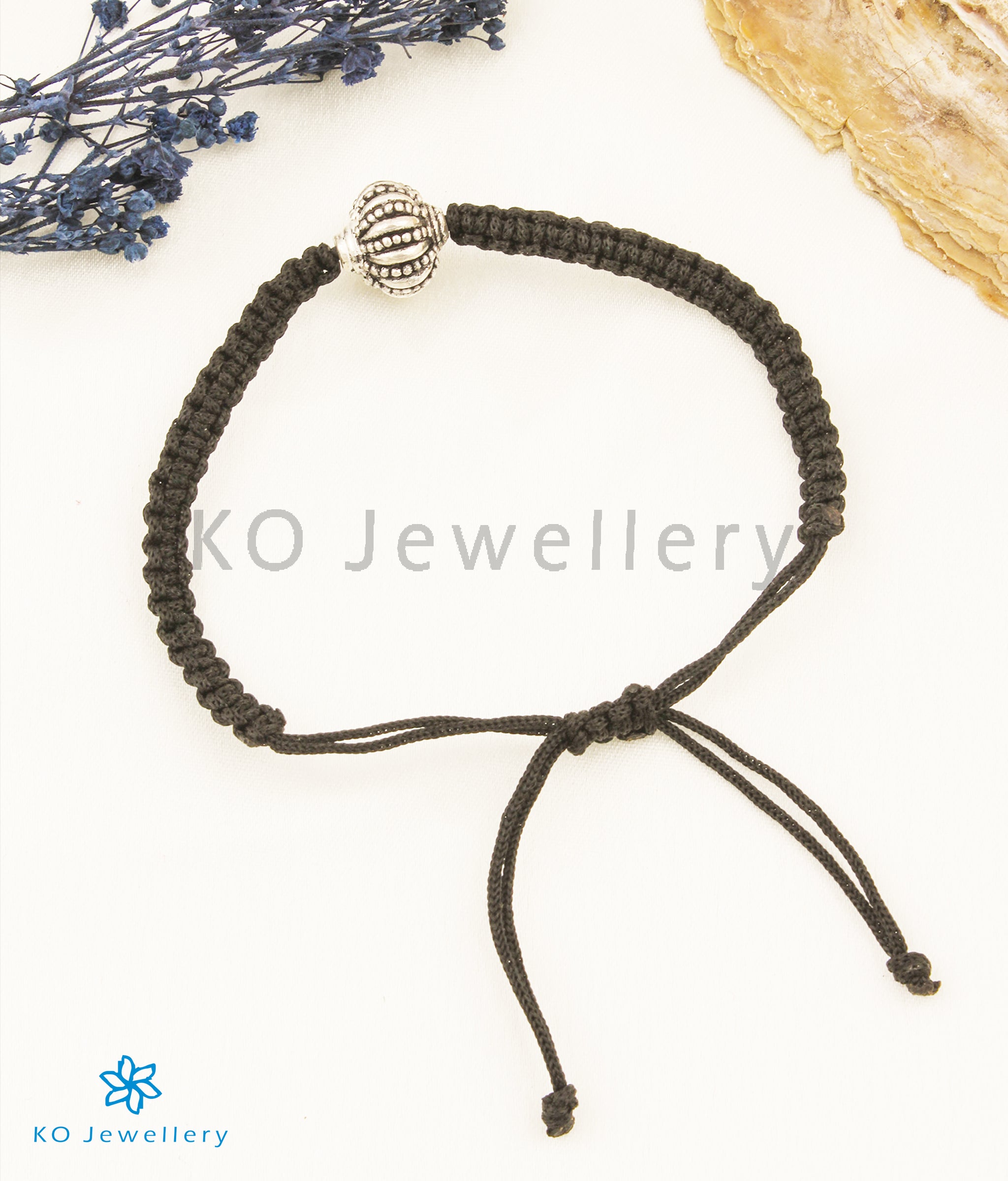 Sport a cool accessory on your wrist , with this pretty handwoven thread bracelet with a single handcrafted Sterling Silver (92.5%) bead at its center. This is a unisex design and has an adjustable strap .