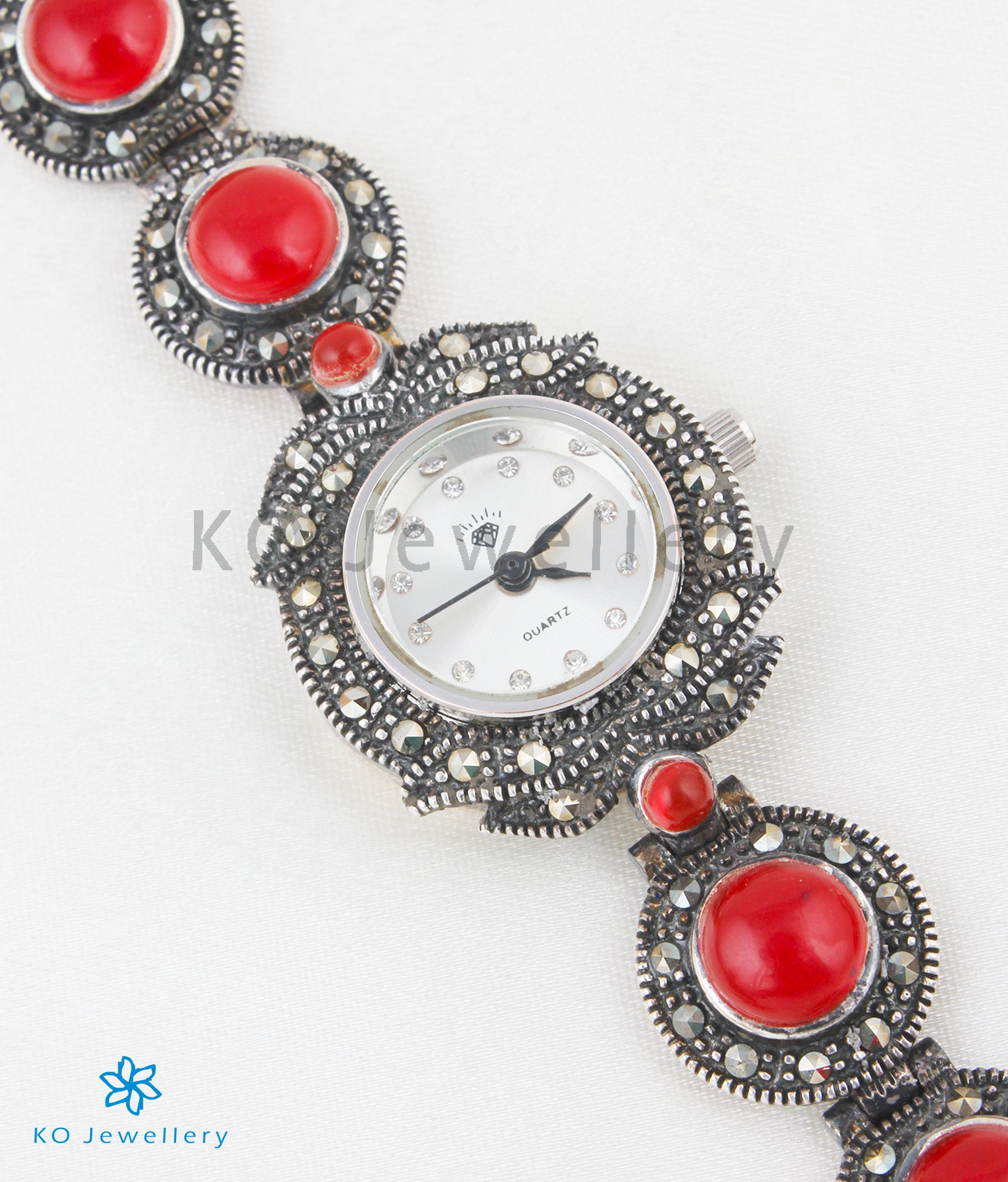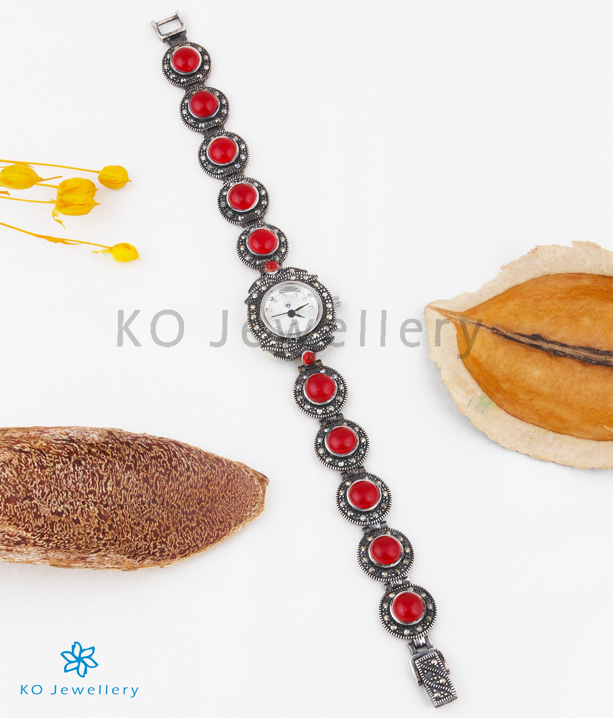 Utterly feminine, with a lot of glitter and colour this is a watch fit for a princess. The straps and dial are entirely made of Sterling Silver (92.5%) and studded with Swiss marcasite stones and red Onyx.