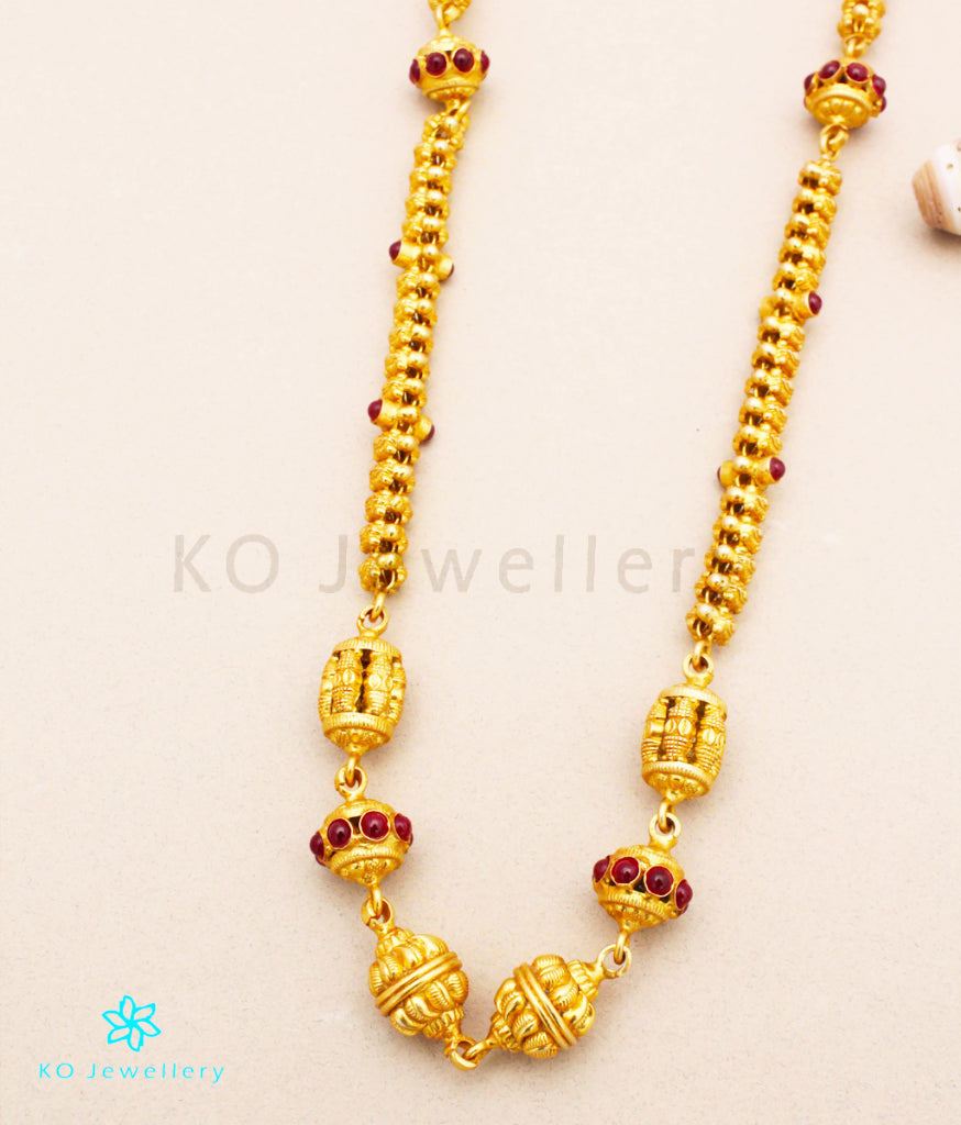 This chain is made up of gold-dipped, Sterling Silver (92.5%) beads that have been decorated with kempu stones. Handcrafted in various intricate designs this is a stunning piece of jewellery.