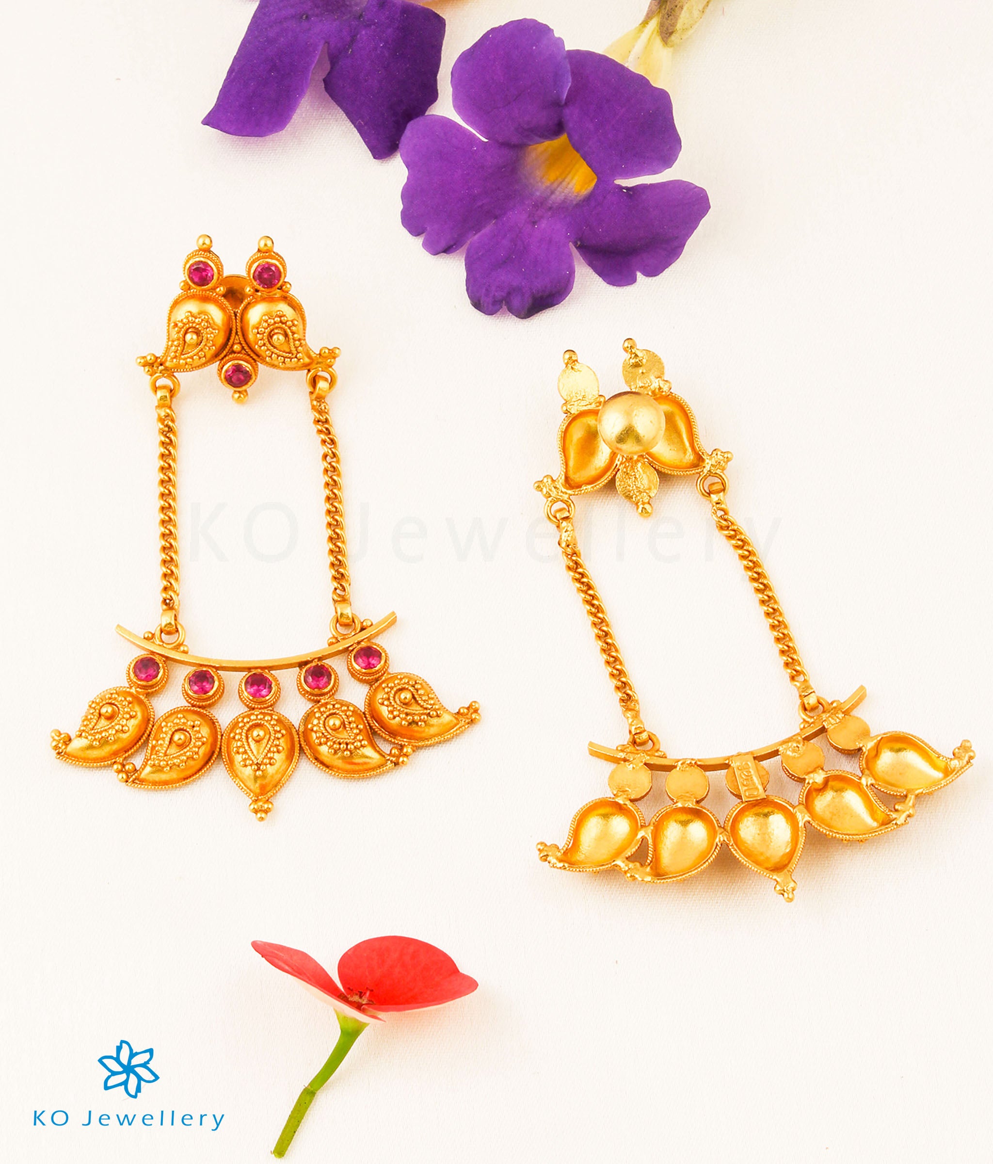 Intricately handcrafted earrings in a mango or paisley shape, handcrafted in Sterling Silver (92.5%) this is a stunning pair. They will look gorgeous paired with your ethnic ensemble on special occasions. This earring comes with a south-screw.
