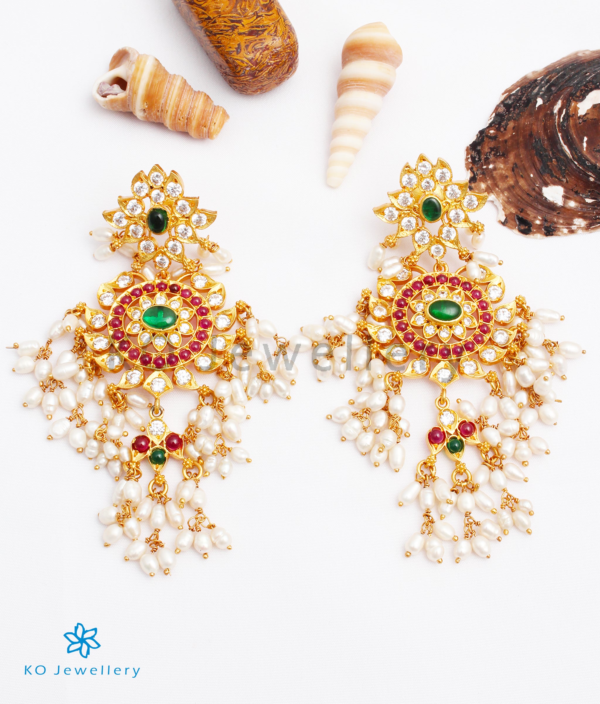 Exquisite and ornate this pair of Sterling Silver (92.5%) earrings with kempu stones and bunch of pearls is sure to put you in the limelight. Perfect for a bride's trousseau this earring is crafted using techniques used in ancient South Indian antique gold temple jewellery.