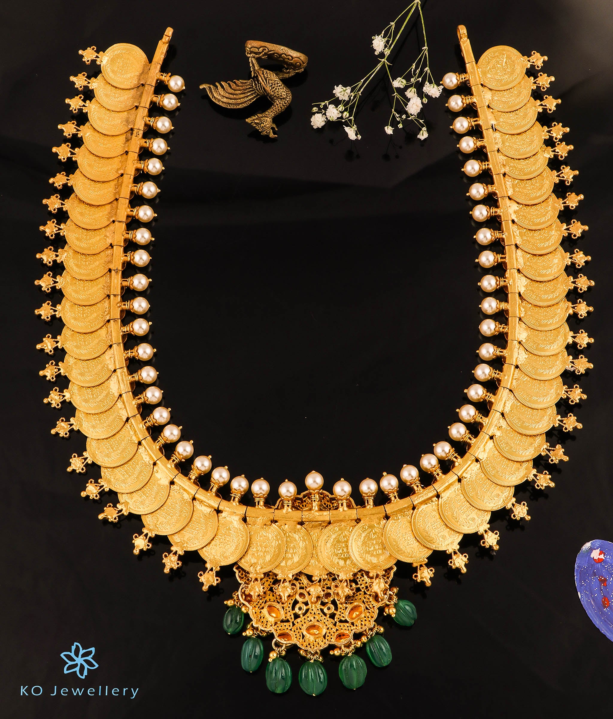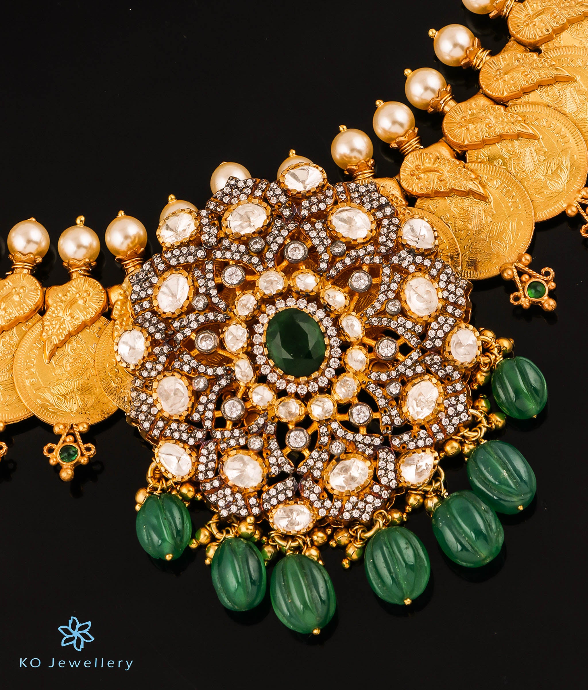 Closely resembling a traditional Indian `kasu-mala' or coin necklace, this design does differ in certain details. The addition of an ornate pendant studded with polki stone and premium AAA+ Quality Cubic Zirconia gives it a special aura. Crafted in pure Sterling Silver (92.5%) and dipped in 24-carat gold this necklace is crafted using techniques used in ancient South Indian antique jewellery.