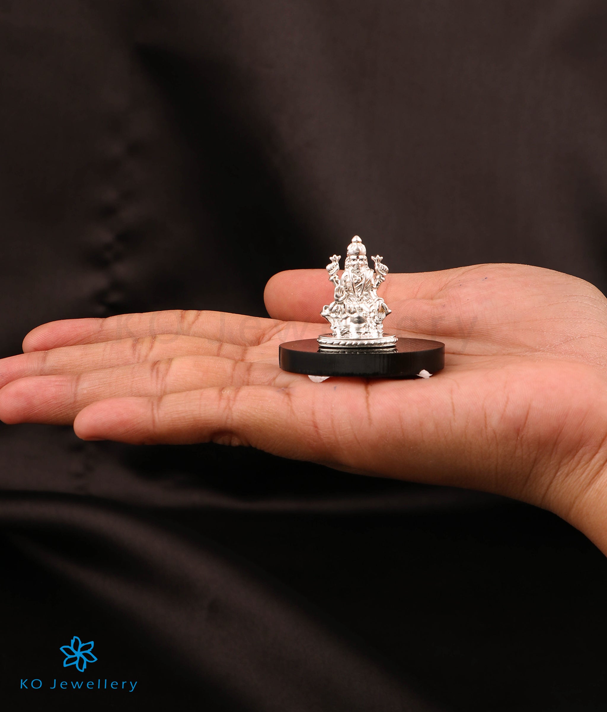 The most auspicious gift for any important occasion is an idol of Lord Lakshmi , the remover of all obstacles. Here we have a precious gift - a pure silver idol of Lord Lakshmi. The idol sits on a resin platform that serves to hold it and highlight its beauty. This piece can be used on your desktop, car dashboard or puja mandap and makes a really memorable gift. The idol comes packaged in a box .