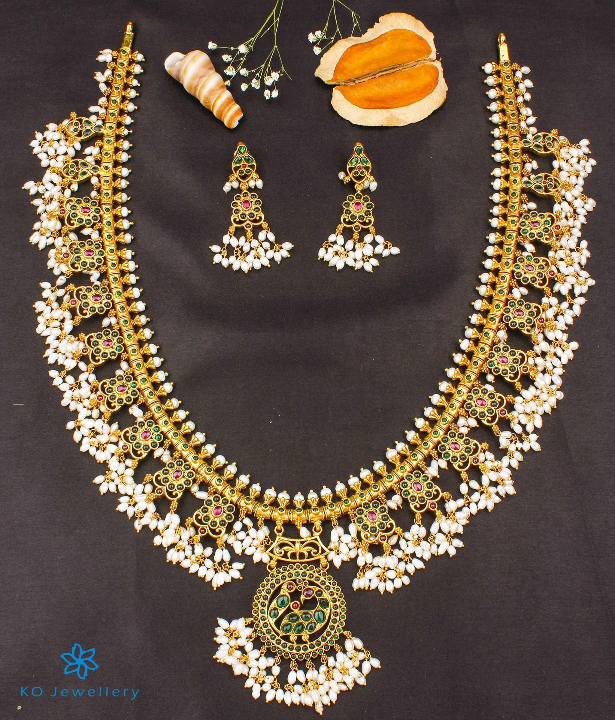 A classic heritage design from Andhra Pradesh, the Guttapusalu gets its name from its signature fringe — clusters of tiny pearls that resemble “a shoal of small fish” (gutta). Pusalu translates to beads, a nod to its origin near the ancient pearl-fishing regions along the Coromandel Coast.