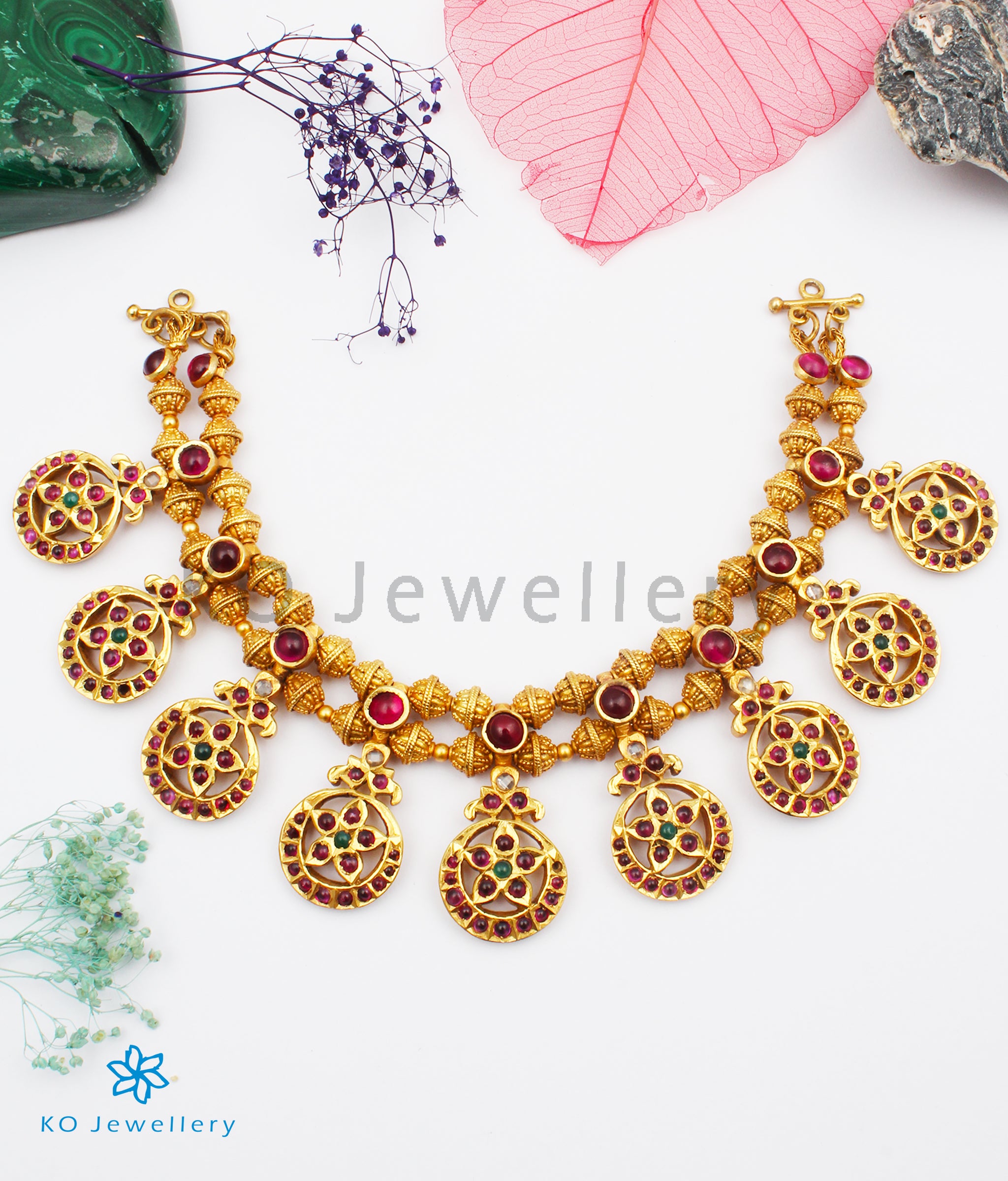 A gorgeous heritage necklace crafted in the ancient 'Kundala Velai' technique of gem-setting characteristic to temple jewellery of Tamil Nadu, this necklace is truly one of a kind. Few examples of this kind of workmanship exist today .
