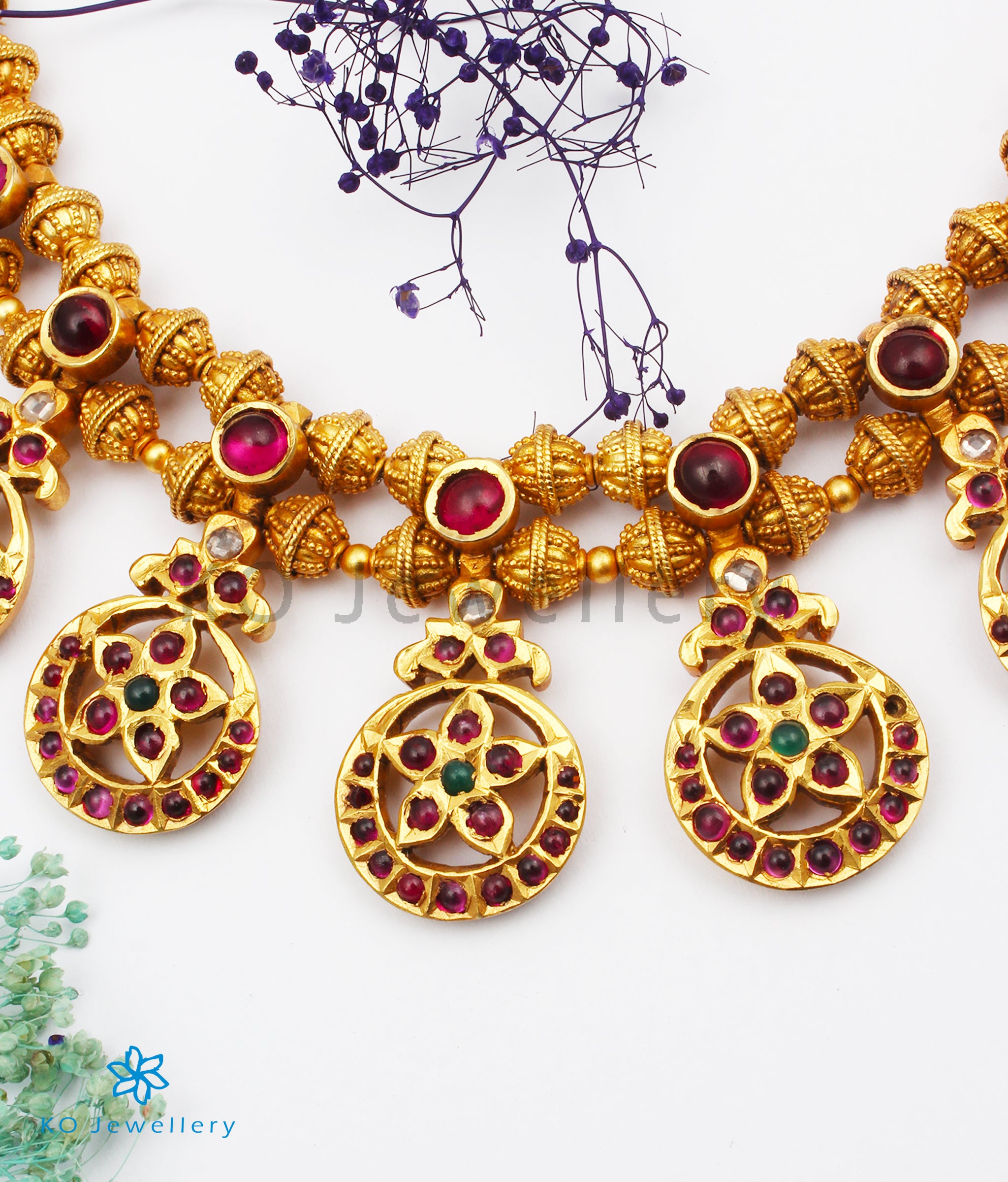 The necklace uses traditional colours of red, green and white (in ancient times rubies, emeralds and diamonds were used) in a flawless floral pattern to mesmerize and awe us with its intricacies of design and flawless craftsmanship. It is crafted in Sterling (92.5) Silver and gold-dipped in a special process to give them an antique look.