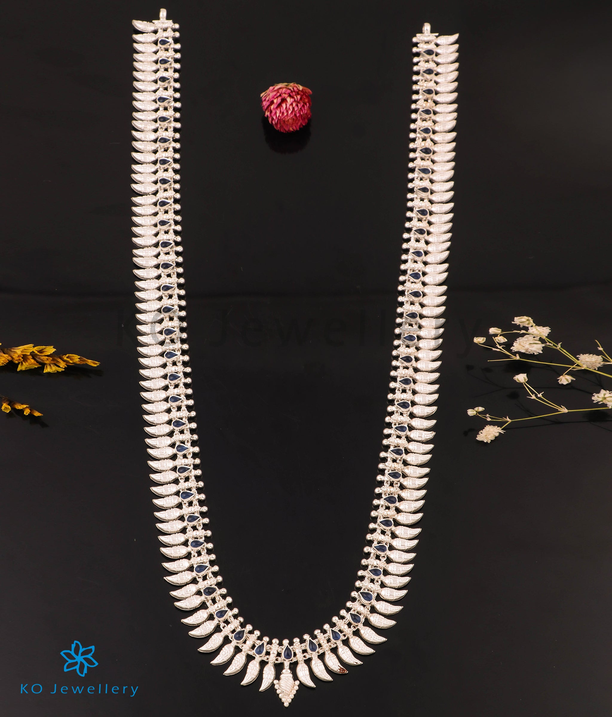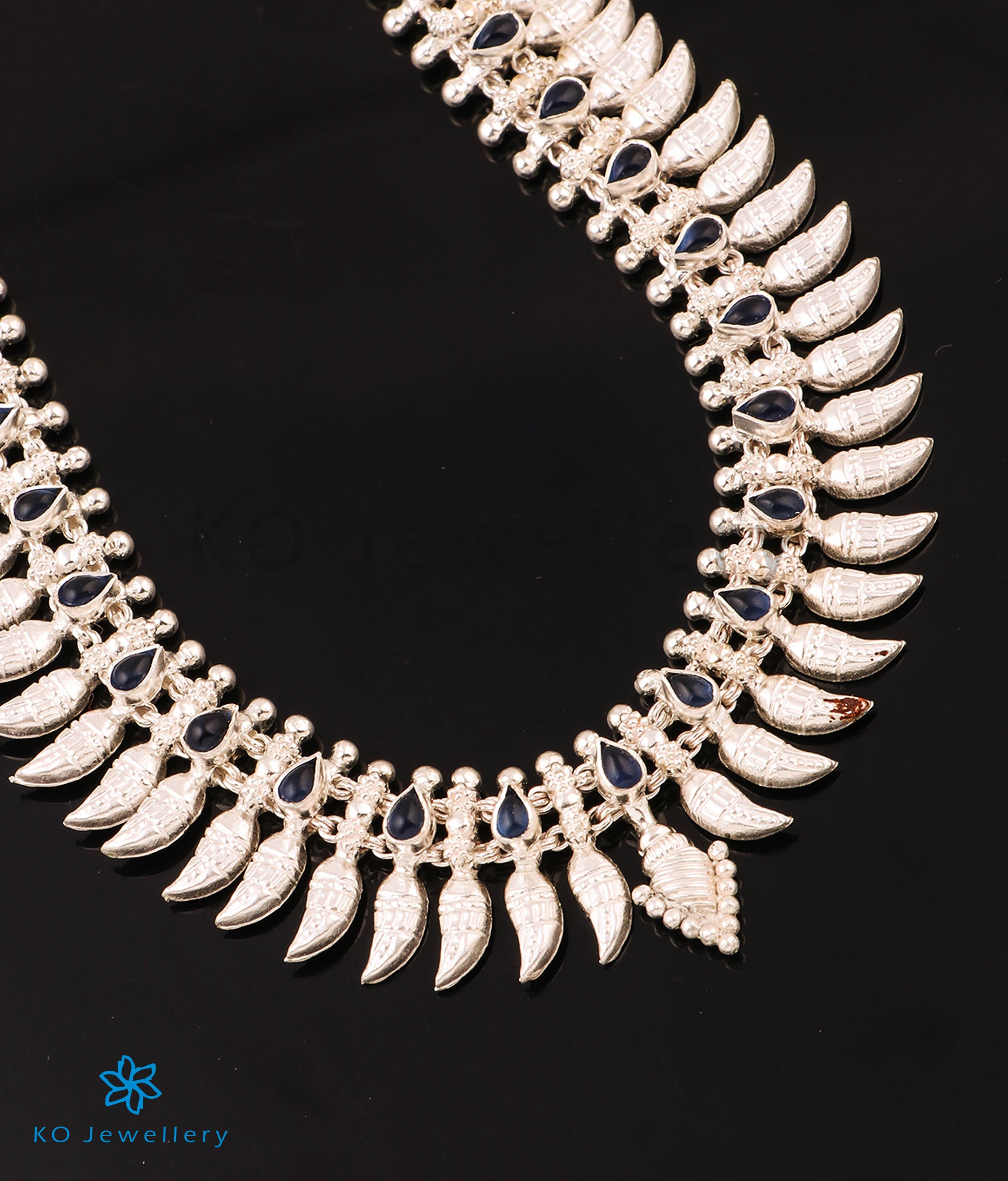 The Malligai Arumbumalai Antique Silver Necklace (Long/Blue)