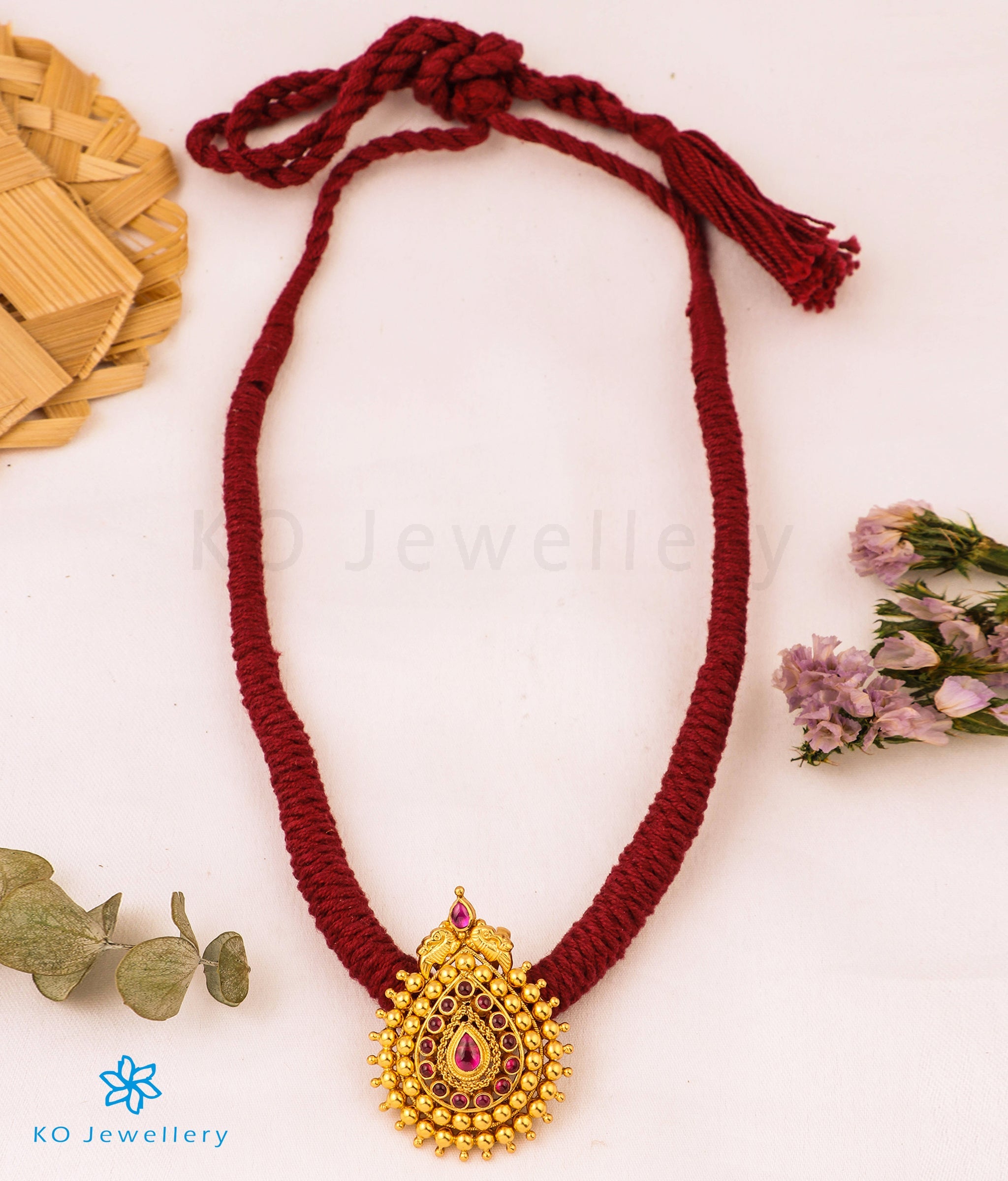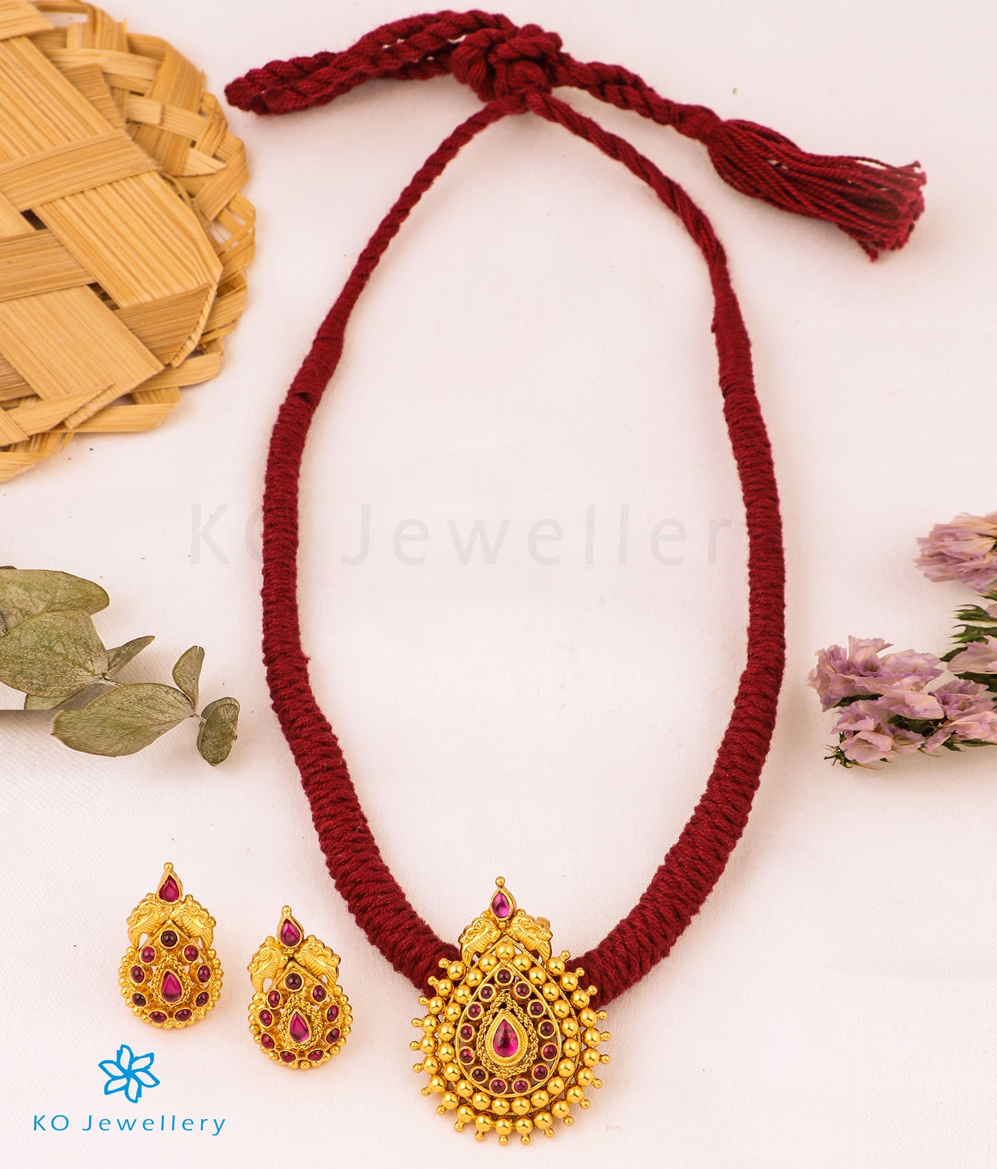 This stunning vintage necklace creates a mesmerising effect with its perfect symmetry and flawless craftsmanship. The beautiful pendant at the center stands out with its attractive design highlighted with kempu stones, and twin-peacocks. The gorgeous gold-dipped pendant is crafted in sterling silver (92.5%) and woven into maroon cotton thread. It is paired with matching earstuds.