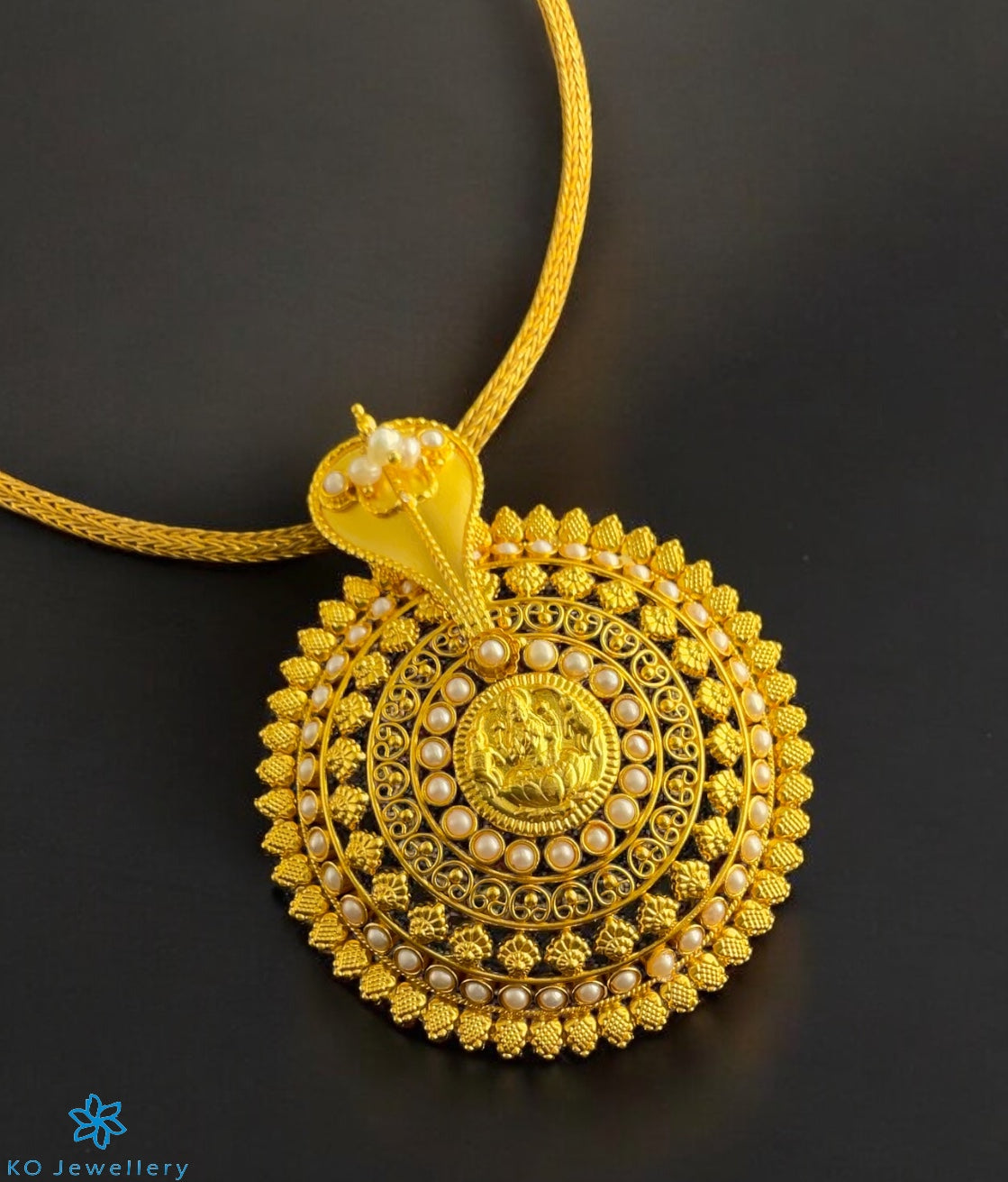 The pendant is a masterpiece of craftsmanship. It features a traditional round shape, crowned with a stylized cobra hood, a powerful symbol of fertility and protection. The pendant is decorated with Pearl adding a touch of vibrancy and elegance. At the heart of the pendant is the divine image of Goddess Lakshmi, embodying prosperity and blessings.
