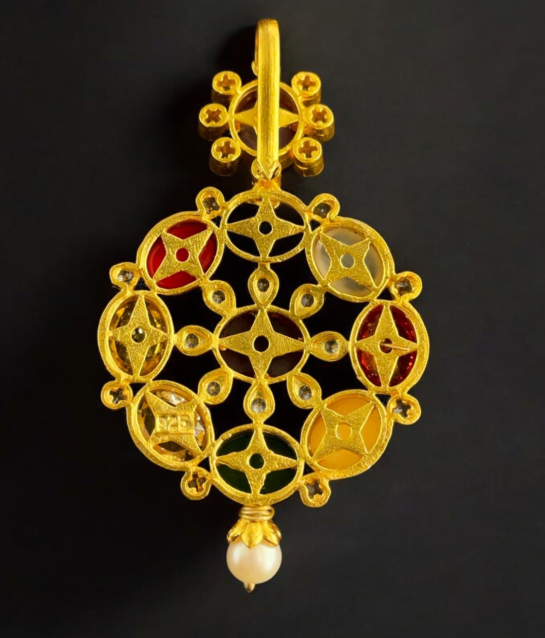 Crafted from high-quality 925 sterling silver, it is luxuriously dipped in 24K gold, giving it a radiant, timeless sheen that enhances its regal appeal. The nine gemstones—ruby, emerald, sapphire, diamond, pearl, coral, topaz, garnet, and cat’s eye—are meticulously set to create a harmonious balance of colors and energies, making each pendant not just a piece of jewelry, but a symbol of power, protection, and prosperity.
