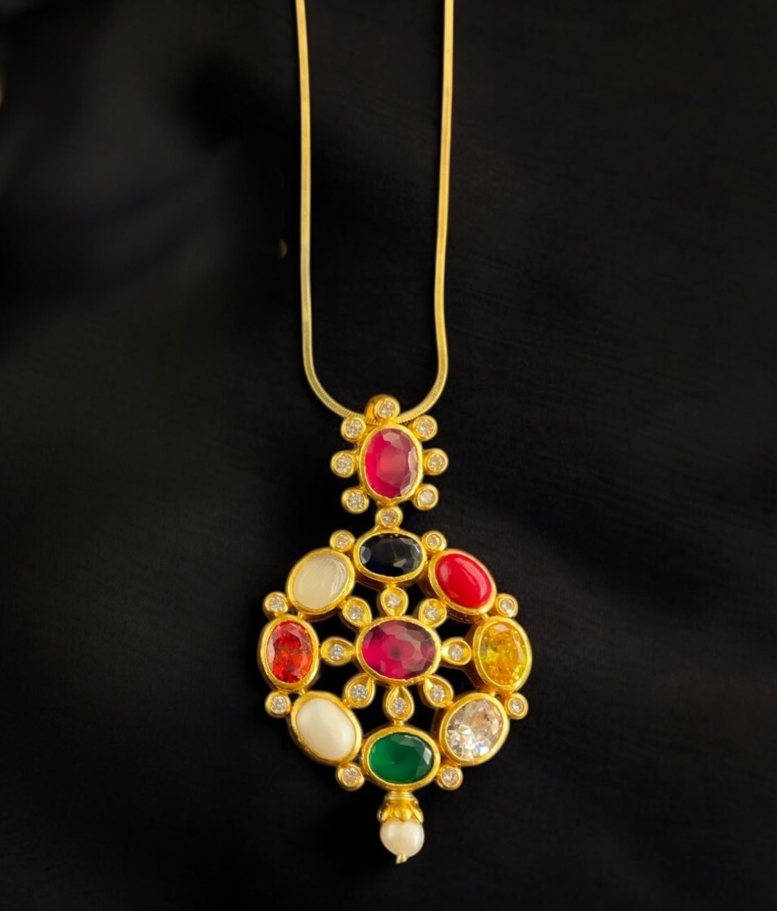 Elevate your style with this stunning Navratna gemstone pendant , a masterpiece of tradition and luxury. Handcrafted using the ancient techniques of temple jewelry making, it is a celebration of both artistry and cultural heritage. Featuring the revered Navratna (nine gemstones), each representing a celestial force and offering a blend of beauty and spiritual significance.