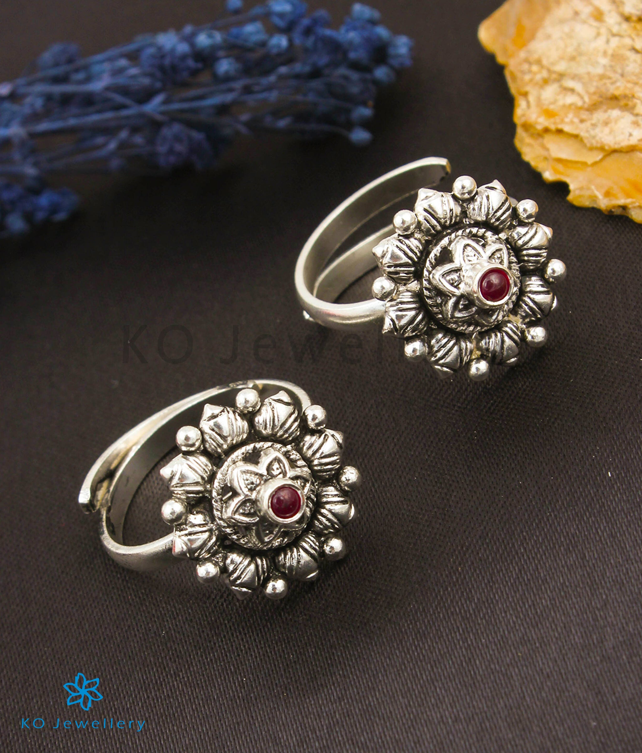 A gorgeous pair of oxidised handcrafted sterling silver (92.5%) toe-rings with kempu stones. The intricate design at the center is decorated with kempu stones and this gives this pair an attractive look. The silver band at the back is an open one and can be adjusted according to your toe-size.