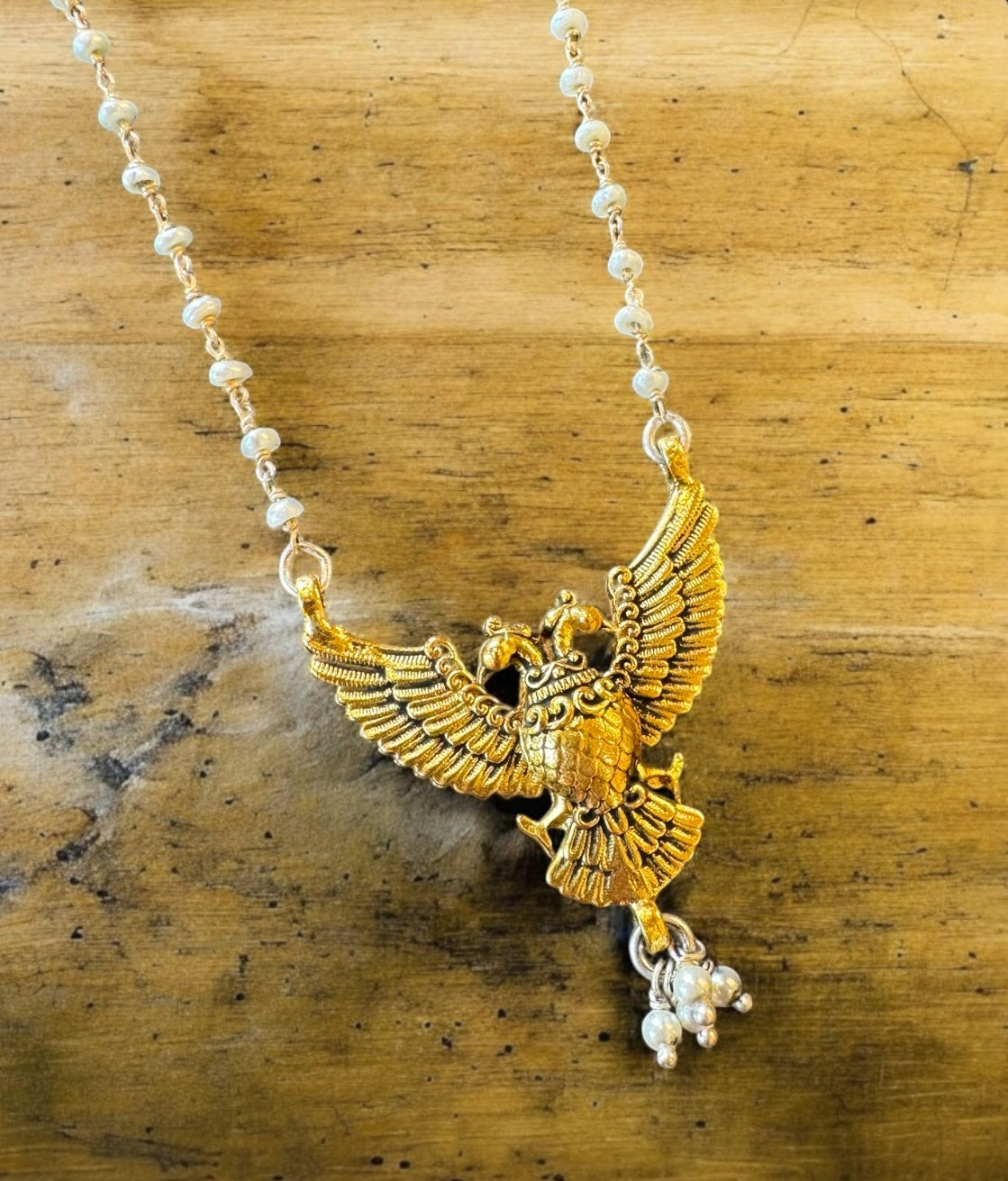 Introducing our Gandaberunda Necklace a breathtaking piece from our Antique Temple Jewellery Collection. This exquisite necklace features a central pendant of the Gandaberunda—a two-headed mythical bird from Hindu mythology, renowned for its immense magical strength and its ability to combat forces of destruction. With heads resembling the mighty eagle and a tail like the majestic peacock, the Gandaberunda symbolizes both power and resilience. The necklace string is made of premium natural cultured Pearl handwoven in pure 925 silver wire .