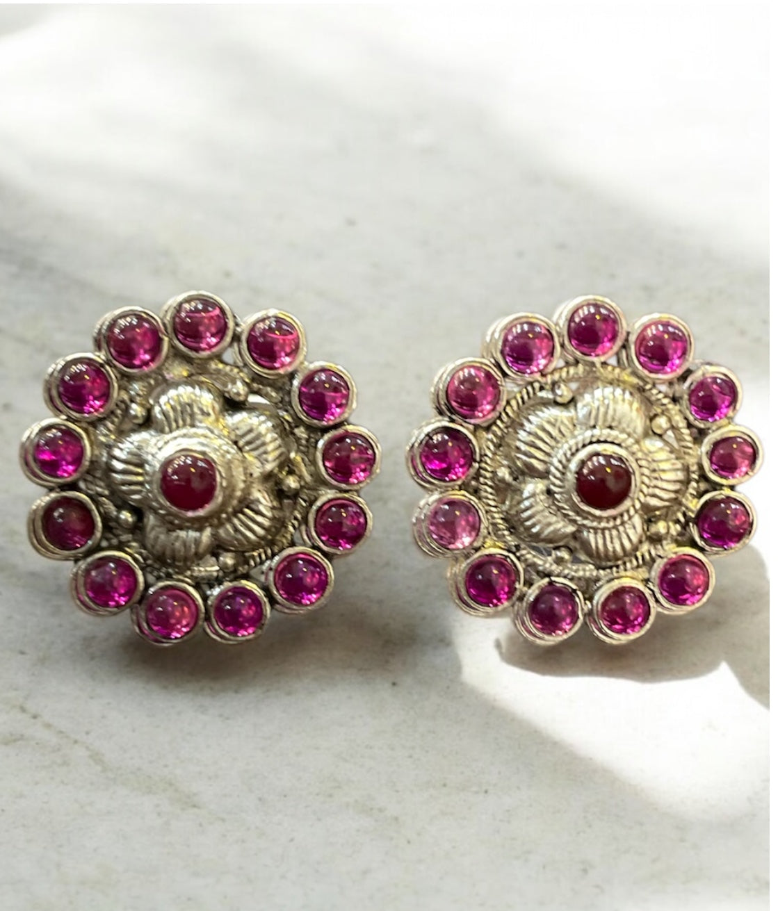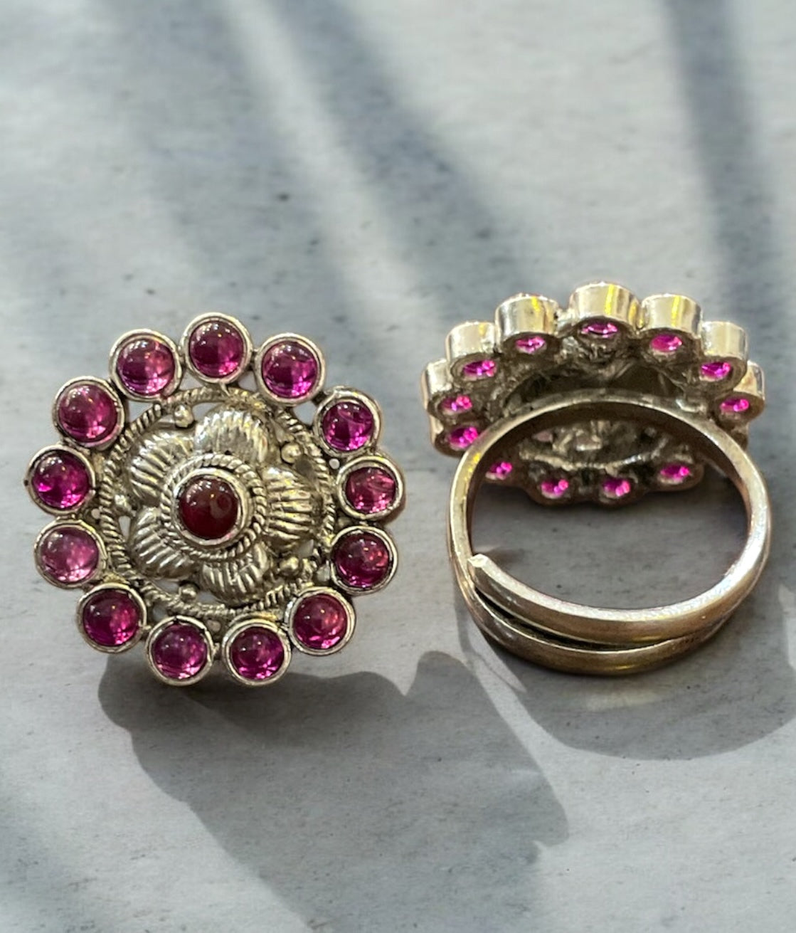 A gorgeous pair of oxidised handcrafted sterling silver (92.5%) toe-rings with kempu stones. This pair features an intricate design at its center, decorated with kempu stones, making it visually appealing. You can adjust the open silver band at the back of the item according to your toe size.
