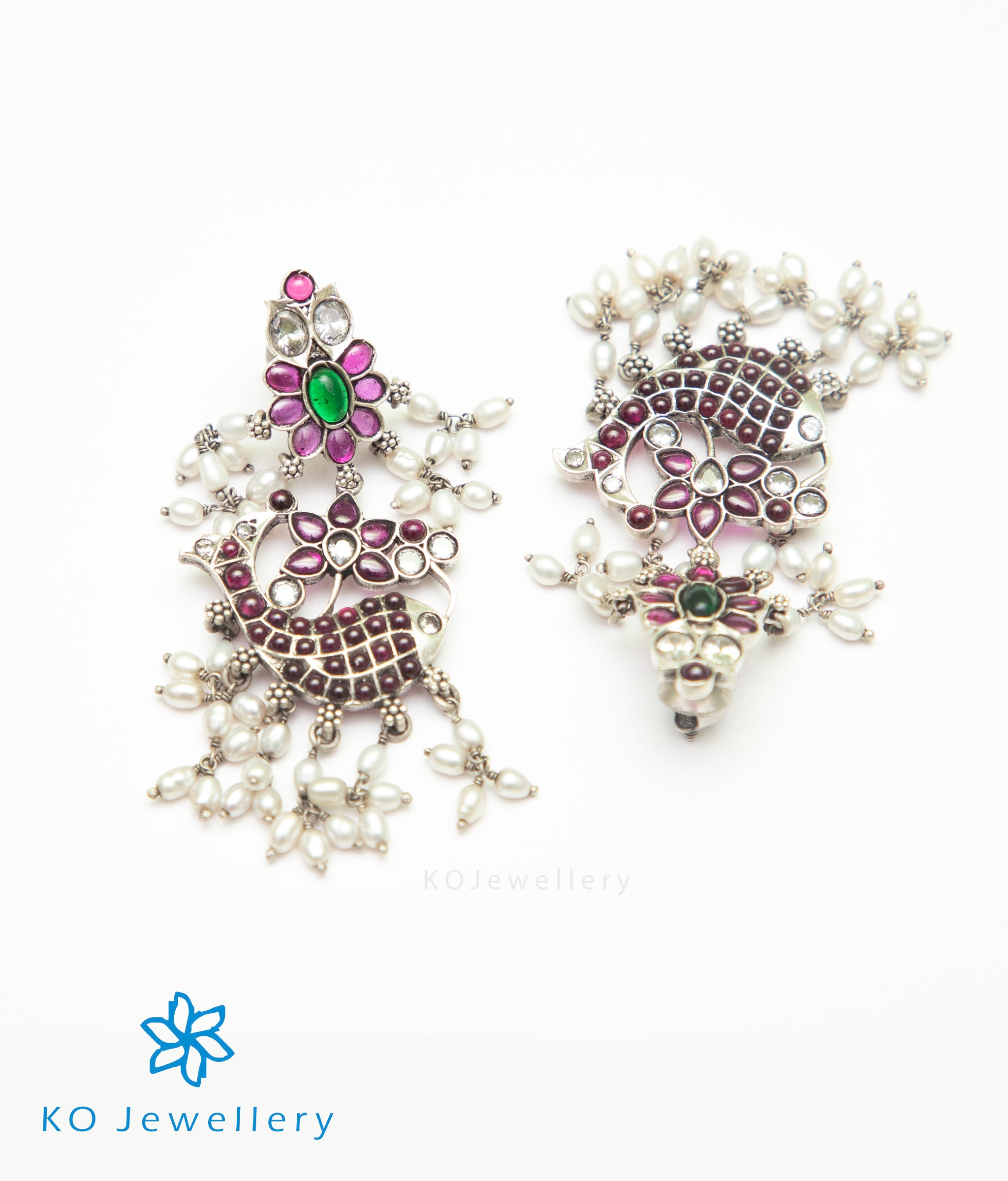 The fish motif is used widely in temple jewellery as it is an auspicious symbol signifying abundance and fertility. Extremely attractive and skillfully handcrafted this `fish-motif' earrings set with `kempu' stones and decorated with pretty pearls is simply stunning .Crafted using techniques used in ancient South Indian antique gold temple jewellery the entire piece is crafted in pure Sterling Silver (92.5%) and oxidised.