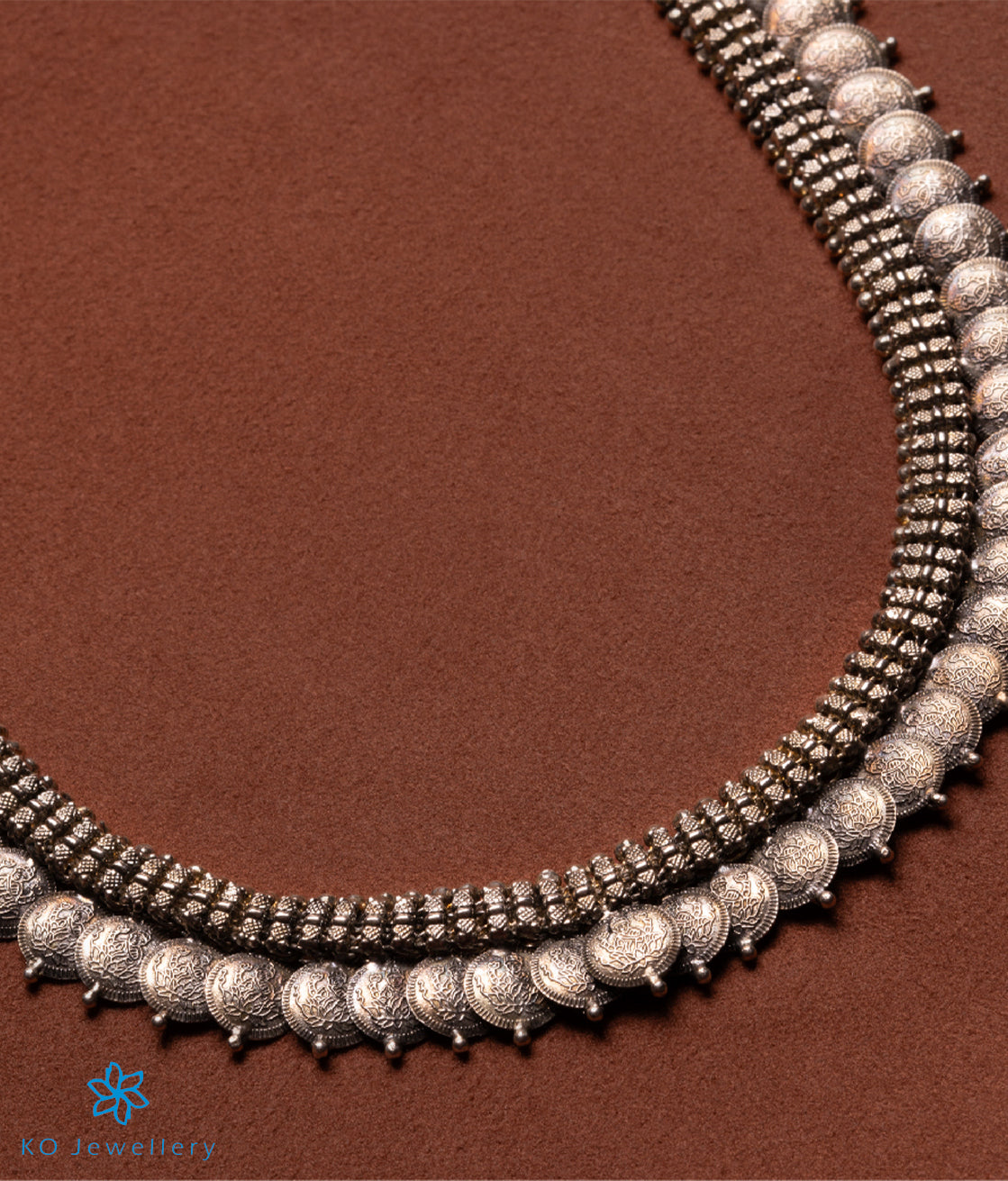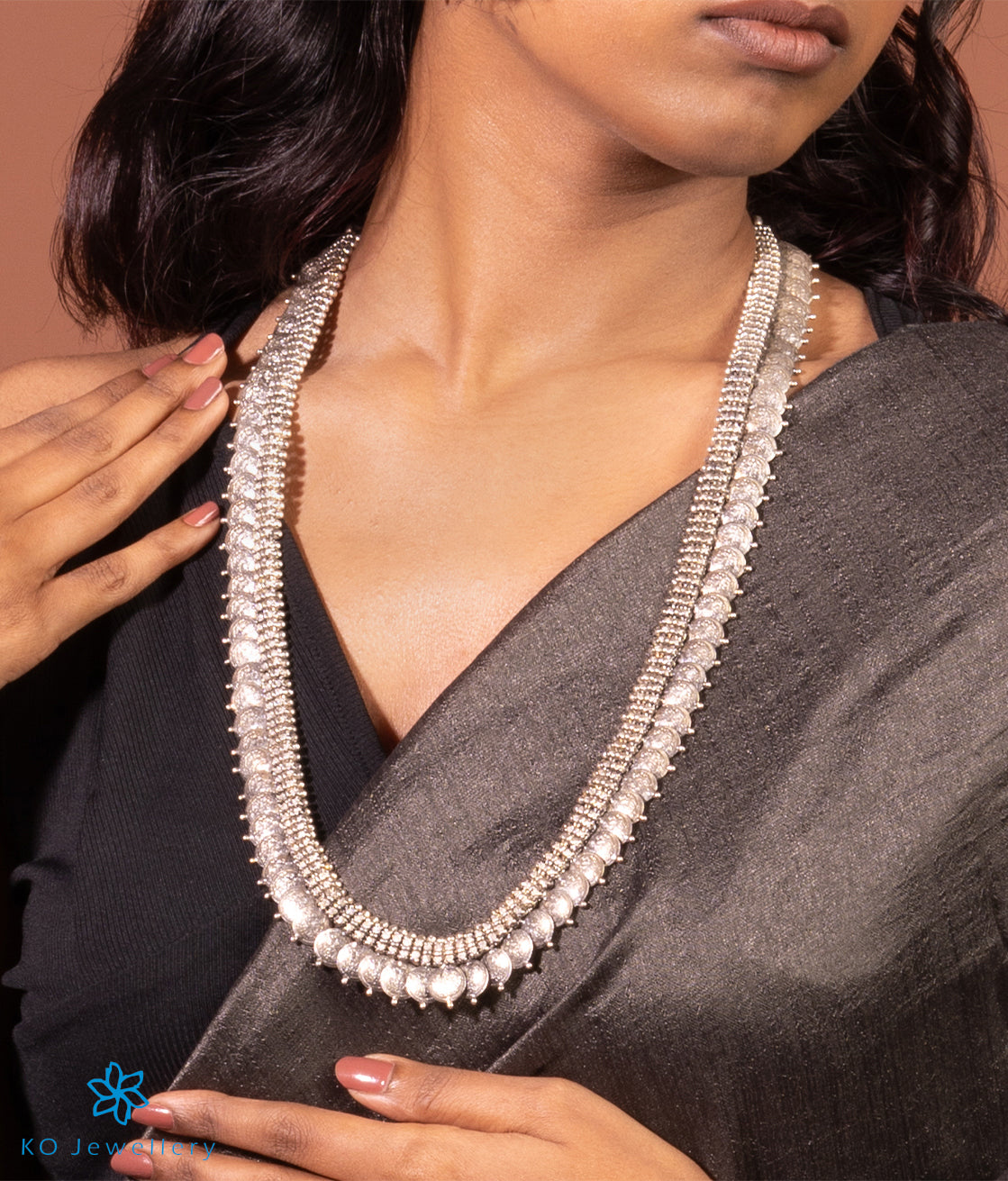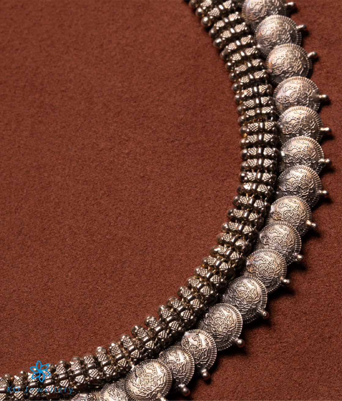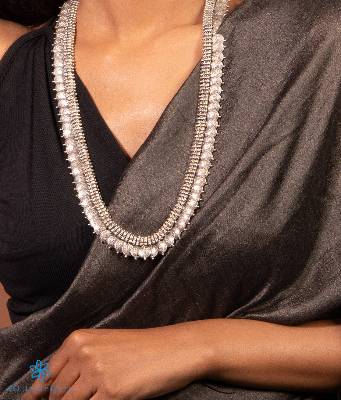 This is a traditional south Indian `kasina-hara', `kasu-malai' or coin necklace, depicting Laxmi the goddess of wealth. Crafted in pure silver and oxidised this kasu mala is made more alluring by the coins depicting Laxmi sitting on a lotus. Part of the Temple Jewellery collection of KO it is crafted using techniques used in ancient South Indian antique jewellery. All pieces in this collection are crafted in Sterling Silver (92.5%).