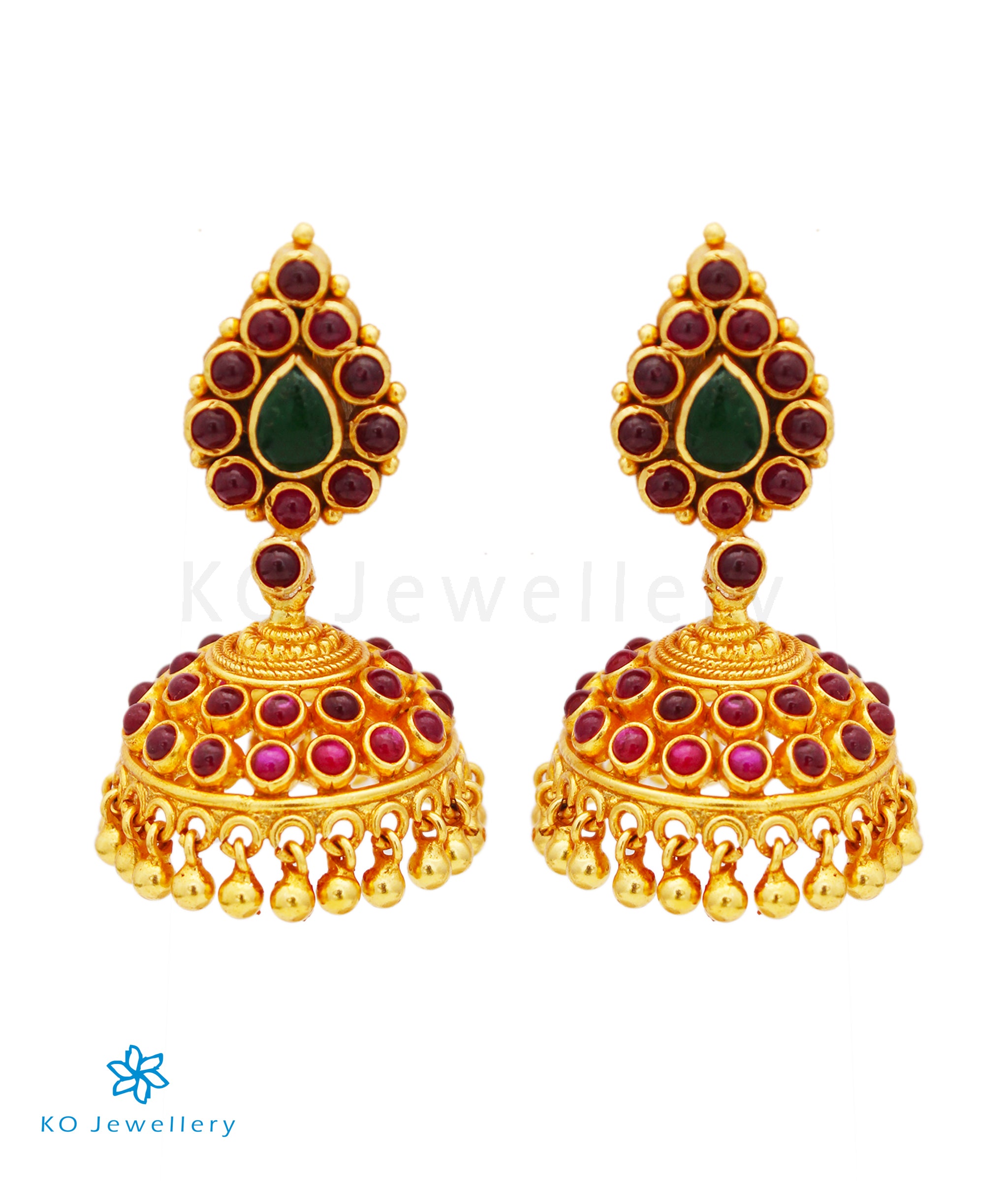 A gold-dipped sterling silver (92.5%) jhumka handcrafted to perfection , decorated with kempu stones. The tear-drop shape ear-stud makes this jhumka more attractive while the beautiful jhumka which is crafted out of pure silver and decorated with kempu stones has a lyrical beauty of its own.
