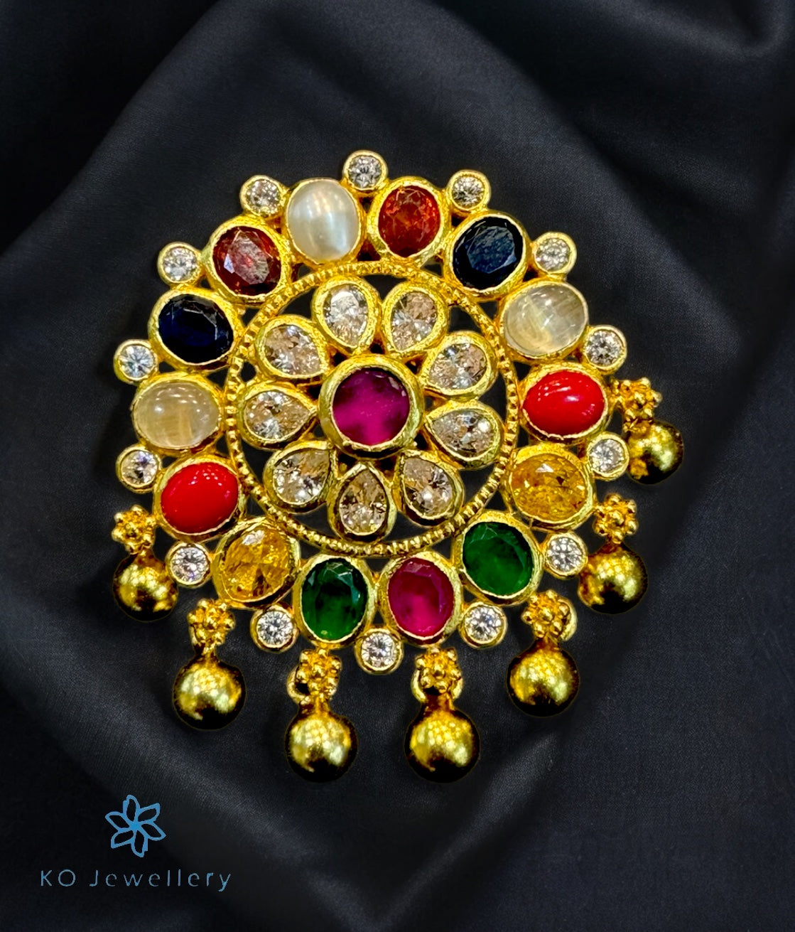 Gemstones used: Natural pearl, red powdered Coral, hessonite, blue sapphire, Cat's eye, yellow sapphire, Garnet, kempu stone (also known as spinel or Zircon),AAA+ Quality Cubic Zirconia.