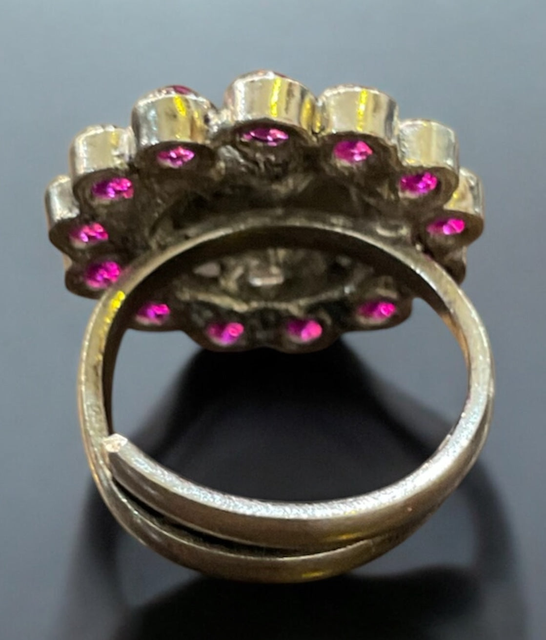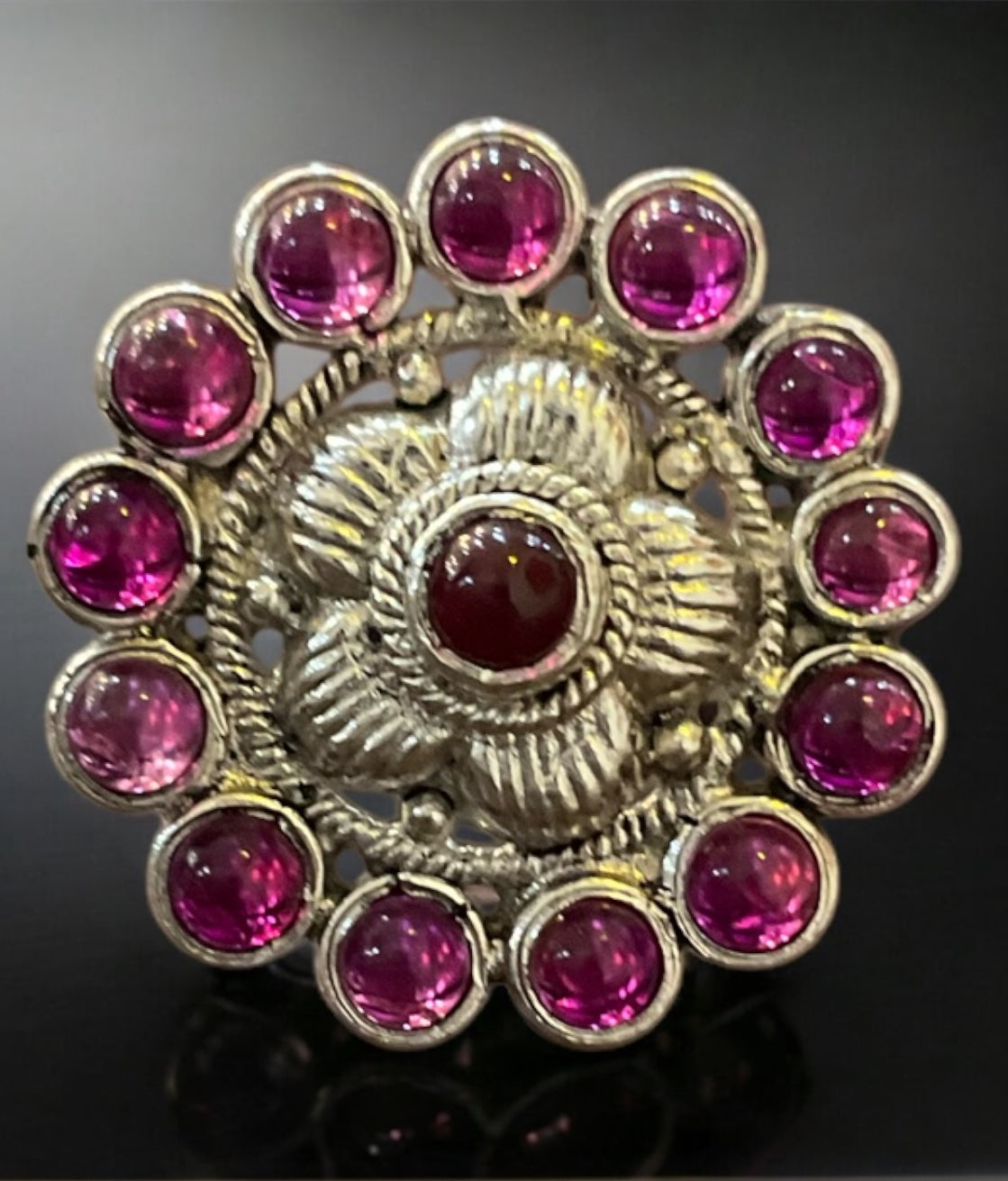 A gorgeous finger ring in oxidised handcrafted sterling silver (92.5%) . This ring features an intricate design at its center, decorated with kempu stones, making it visually appealing. You can adjust the open silver band at the back of the item according to your size.